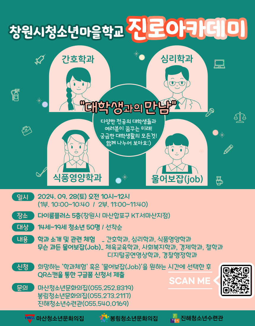 2024년 창원시 청소년 마을학교 진로아카데미 - 대학생과의 만남 신청 설문지입니다! 일시 : 2024년 9월 28일 오전 10시~12시 장소 : 다이룸플러스 5층 (창원시 마산합포구 3·15대로 305 KT서마산지점)
