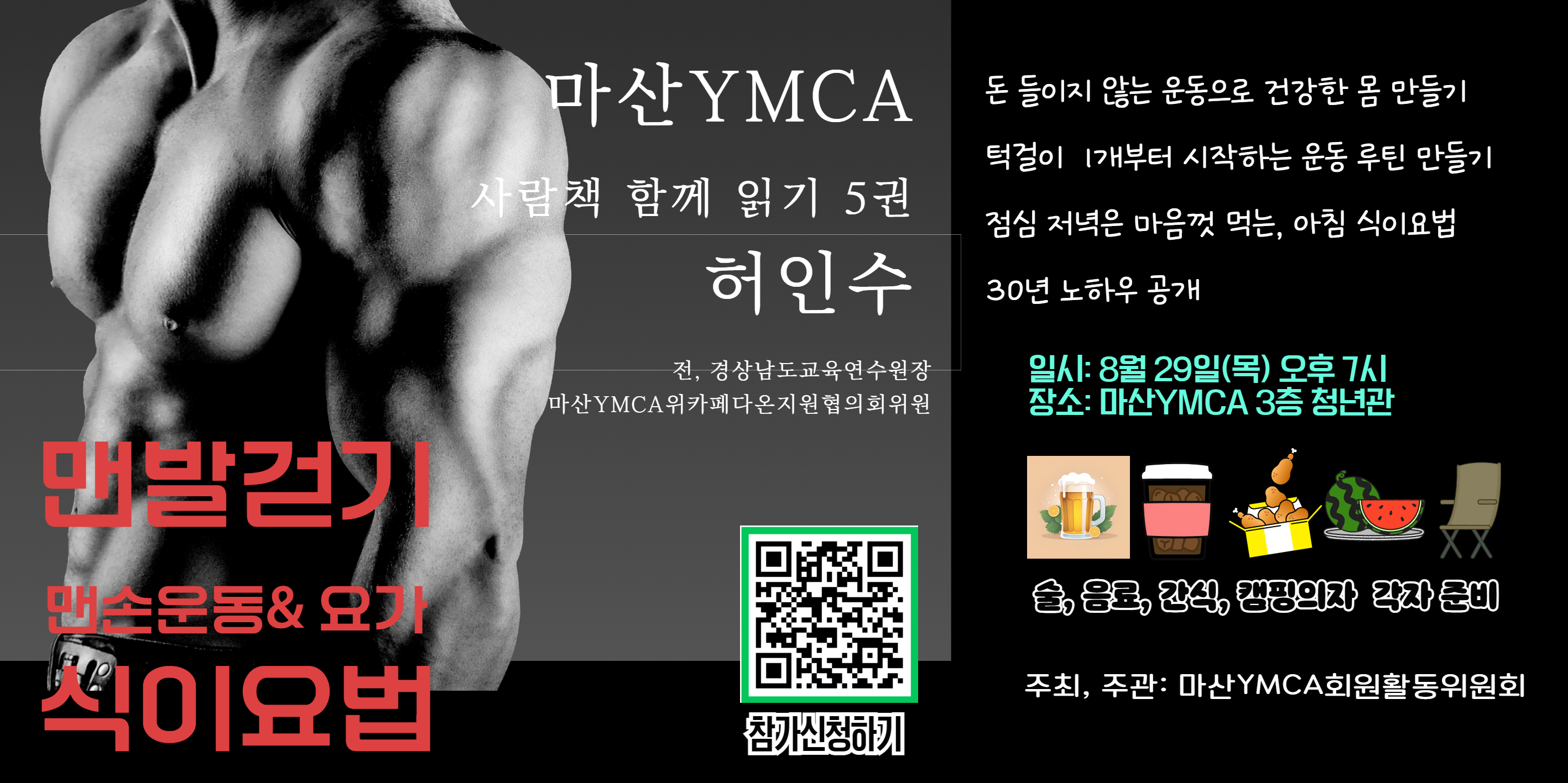 몸짱 허인수 위원의 맨손운동과 요가 그리고 식이요법을 배우는 마산YMCA 사람책 함께 읽기를 지난 8월 29일(목) 저녁 7시 회관에서 진행하였습니다. 사전 수강 신청 인원이 많지 않아 걱정하였습니다만, 당일 날 사전 신청없이 참여한 회원들 덕분에 20여 명의 회원들과 함께 성황리에 진행하였습니다.