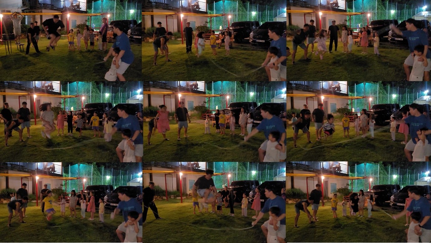 아빠들도 금방 저녁을 먹고 나와 아이들과 줄넘기와 원반던지기 등을 하며 즐거운 저녁시간을 보냈습니다.
