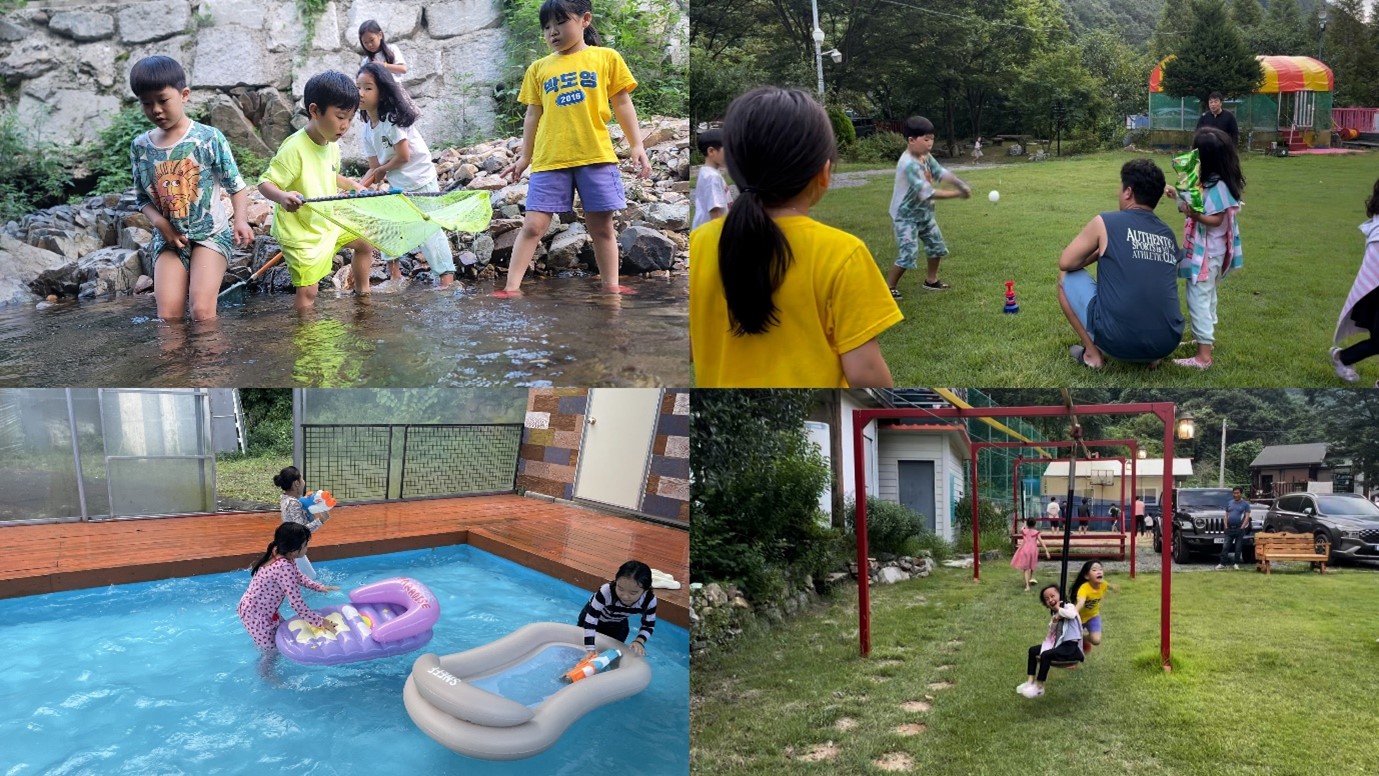 7세친구들은 아기스포츠단에서 진행된 무학산 등반을 마친 직후 밀양으로 달려온 친구도 있었습니다. 하지만 피곤한 기색 없이 도착한 친구들은 물놀이, 물고기 잡기, 집라인 타기 등 다양한 방법으로 막바지 여름을 즐겼습니다.