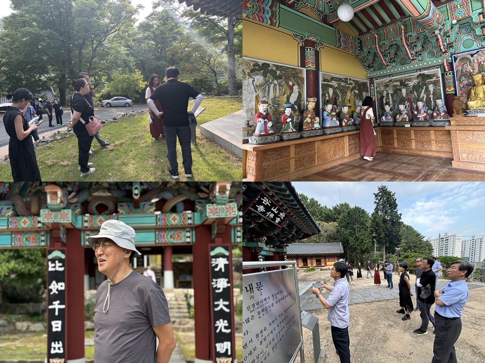 이지순 회원은 결국 카페에서 기다리기로 하고 나머지 회원들은 성주사 입구에 있는 동종을 확인하였습니다. 그런데 예전에는 없었던 코끼리상과 곰상(하얀색으로 도색)이 눈에 들어왔습니다. 조금은 부조화스러움에 회원들은 불편한 기색이 드러나기도 했습니다. 그리고 상업적인 사찰임을 증명이라도 한 듯 대웅전 등 곳곳이 공사 중이라 어수선했습니다.