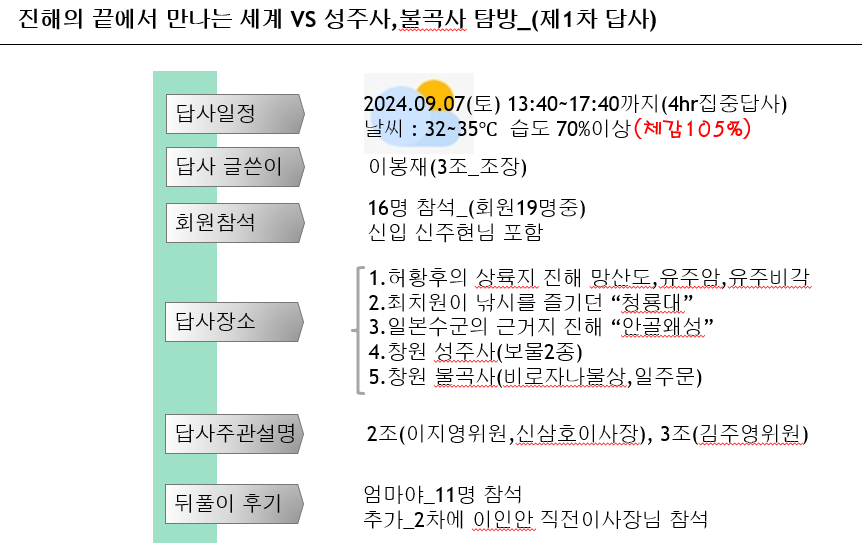 다시 한 번 말씀 드리자면 한증막 같은 무더운 날씨에 열정적으로 설명해 준 김주영 회원에게 진심으로 감사드립니다. 그 외 중간 중간 허정도 회원, 신삼호 회원, 이승준 회원, 옥명훈 회원, 김태석 회장 등등 부족한 부분 설명을 보태주는 모습에서 ‘역사와 문화’ 동아리가 무궁한 발전이 기대하게 되었습니다.