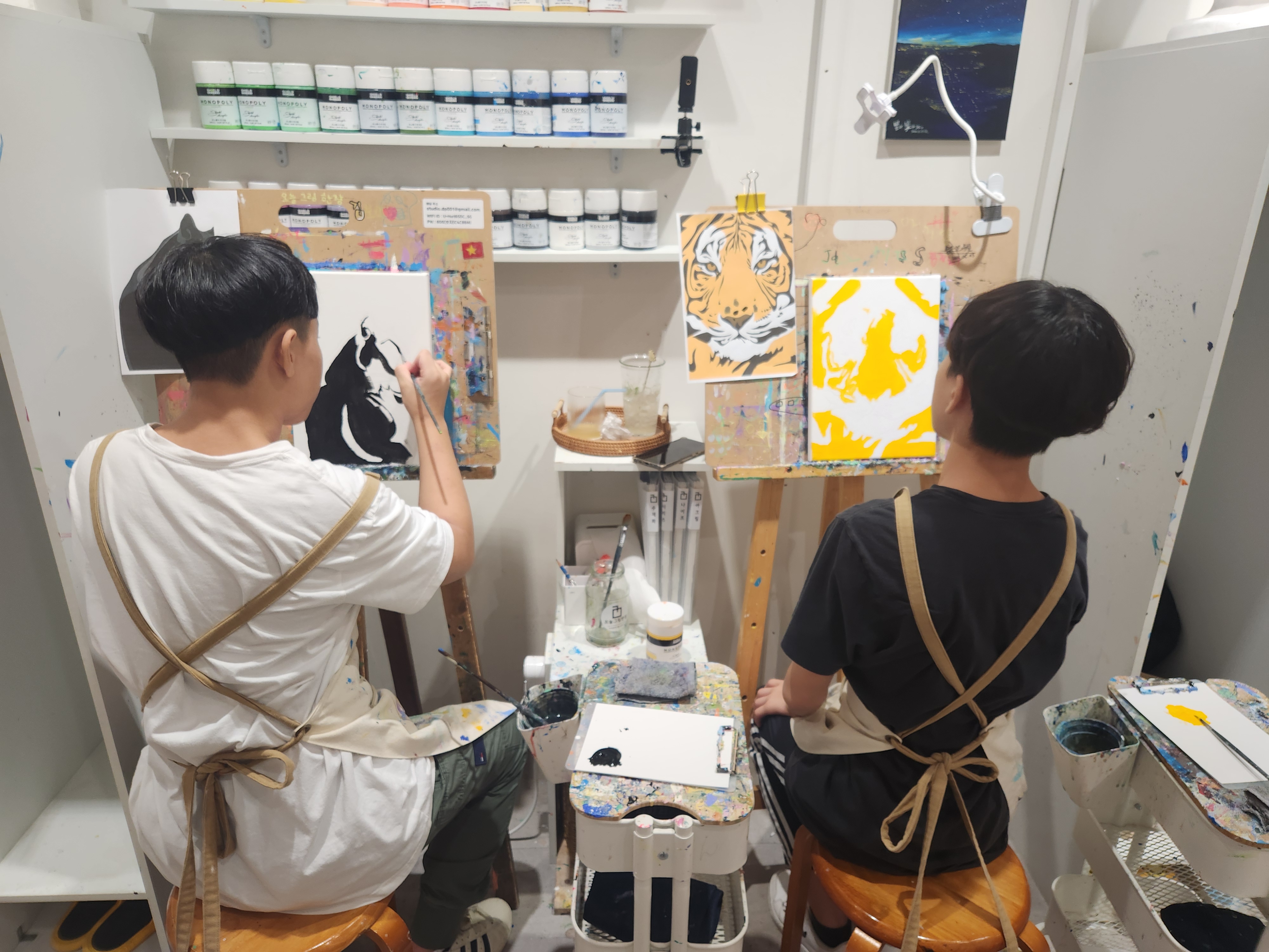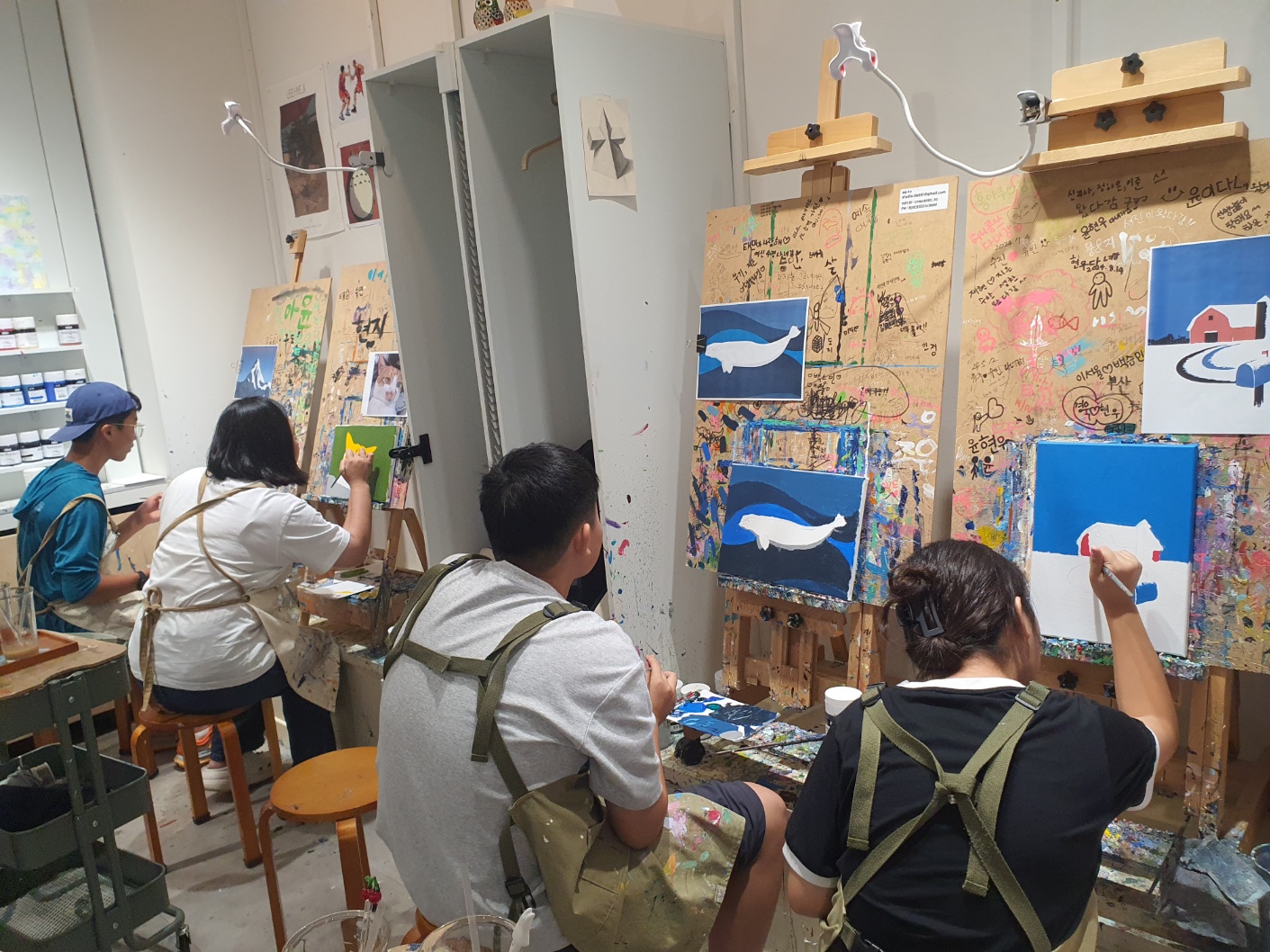 부산대학교에서 단체 사진을 촬영하고 대학가 앞 맛집에서 점심식사를 한 후, 부산 내 유명한 드로잉카페에 가서 아크릴체험을 하였습니다. 각자 원하는 도안을 정하여 흑백지로 스케치를 한 다음, 아크릴 물감으로 그림 그리는 체험입니다. 한 자리에 앉아 장시간 그림에 집중하는 것이 쉽지 않은데도 청소년 모두 자신의 그림에 집중하여 그리는 모습을 보였습니다.