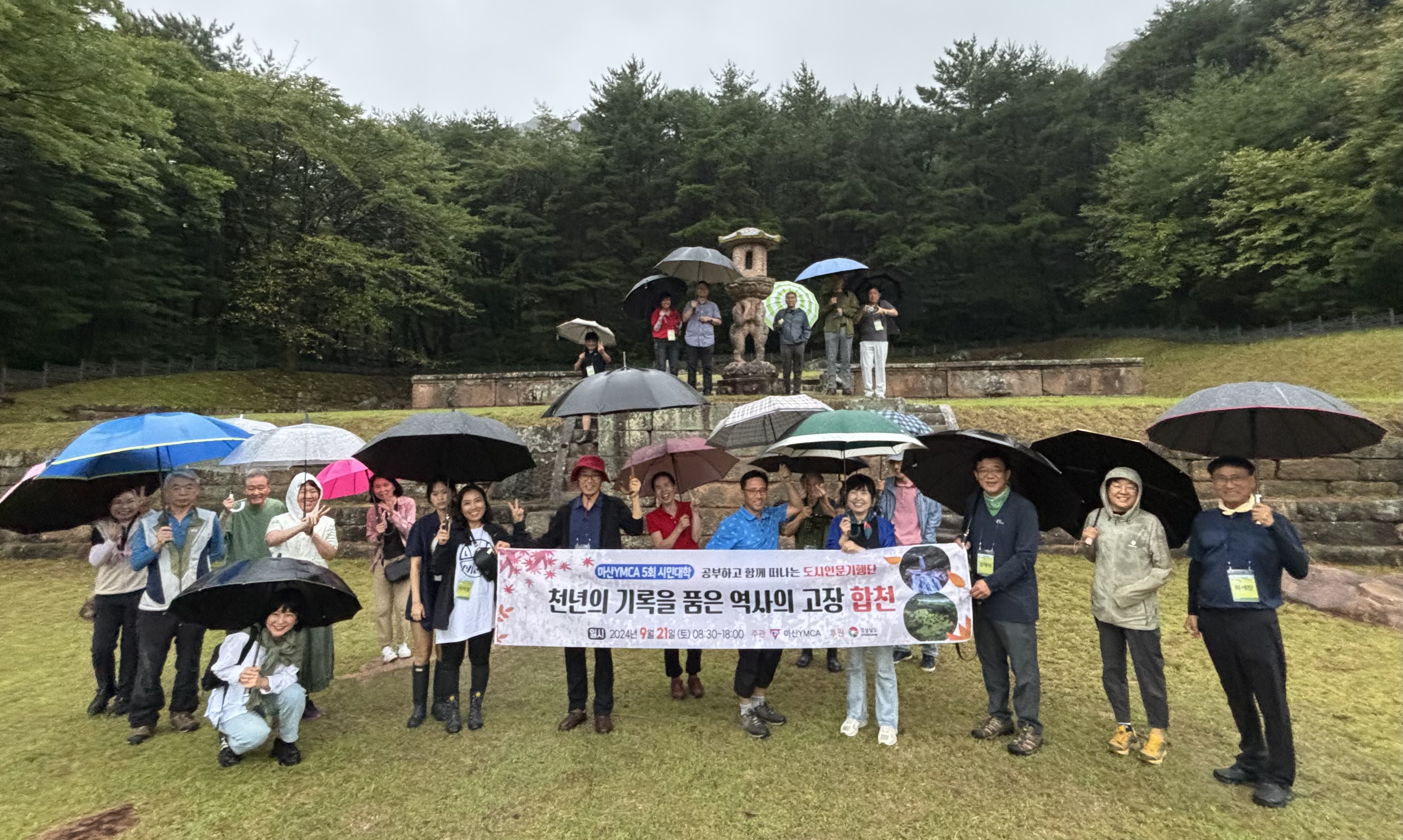그 상황 속에서도 김주용 위원은 최선을 다했습니다. 마지막 코스인 ‘영암사지’로 향하는 동안 정호승 시인의 ‘폐사지처럼 산다’를 낭독하고 지역 행사 안내 등 버스 안에서 다양한 정보와 감동을 전하기도 했습니다. ‘영암사지’에 도착하니 꽤 많은 비가 내렸습니다.