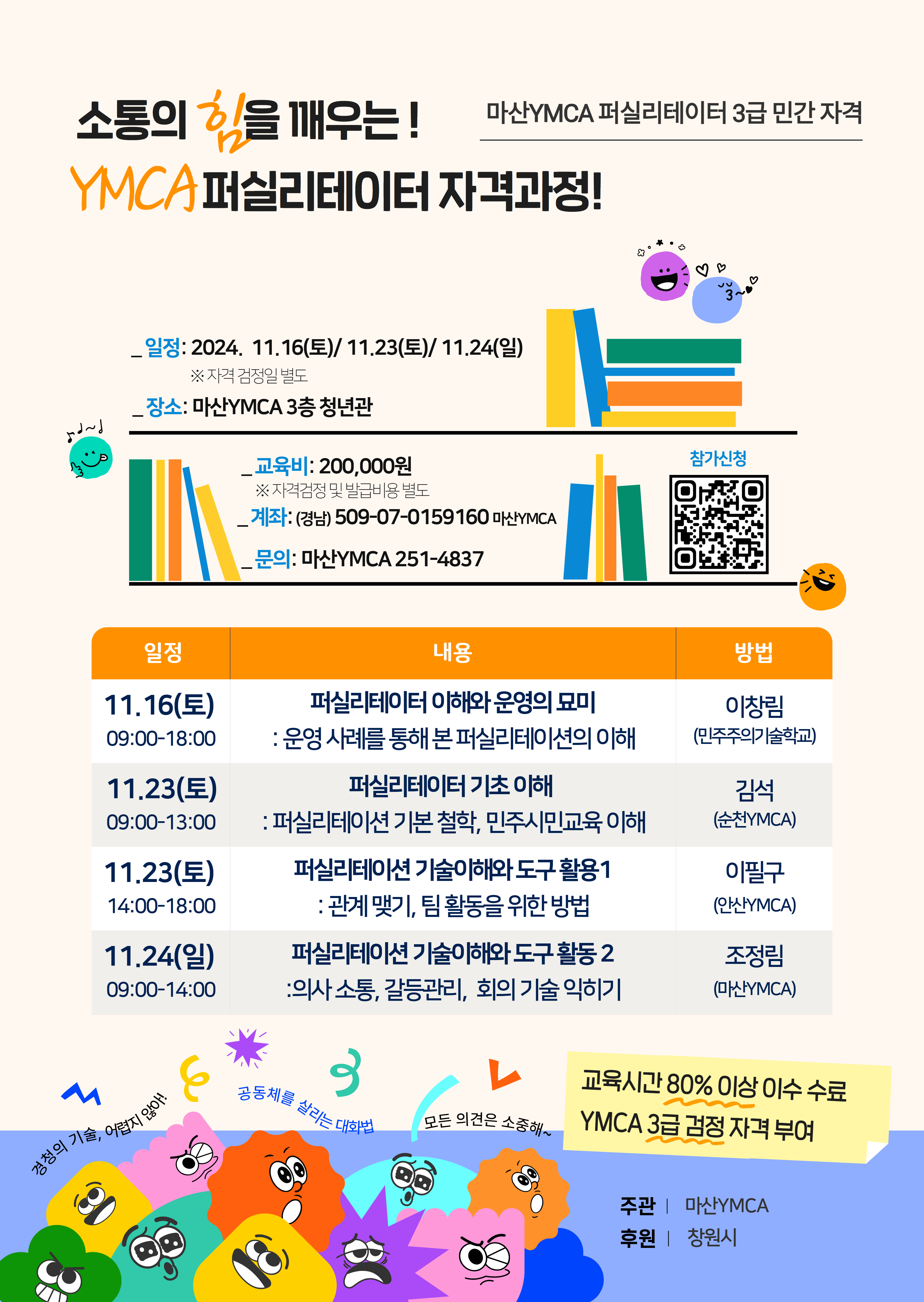 지역 활동가형 퍼실리테이터 양성과정 '퍼실리테이터로 지역공동체를 촉진하다.' 퍼실리테이터 자격 3급 과정 -일시: 2024년 11월 16일(토)/ 11월 23일(토)/ 11월 24일(일)(자격검정 별도) -장소: 마산YMC