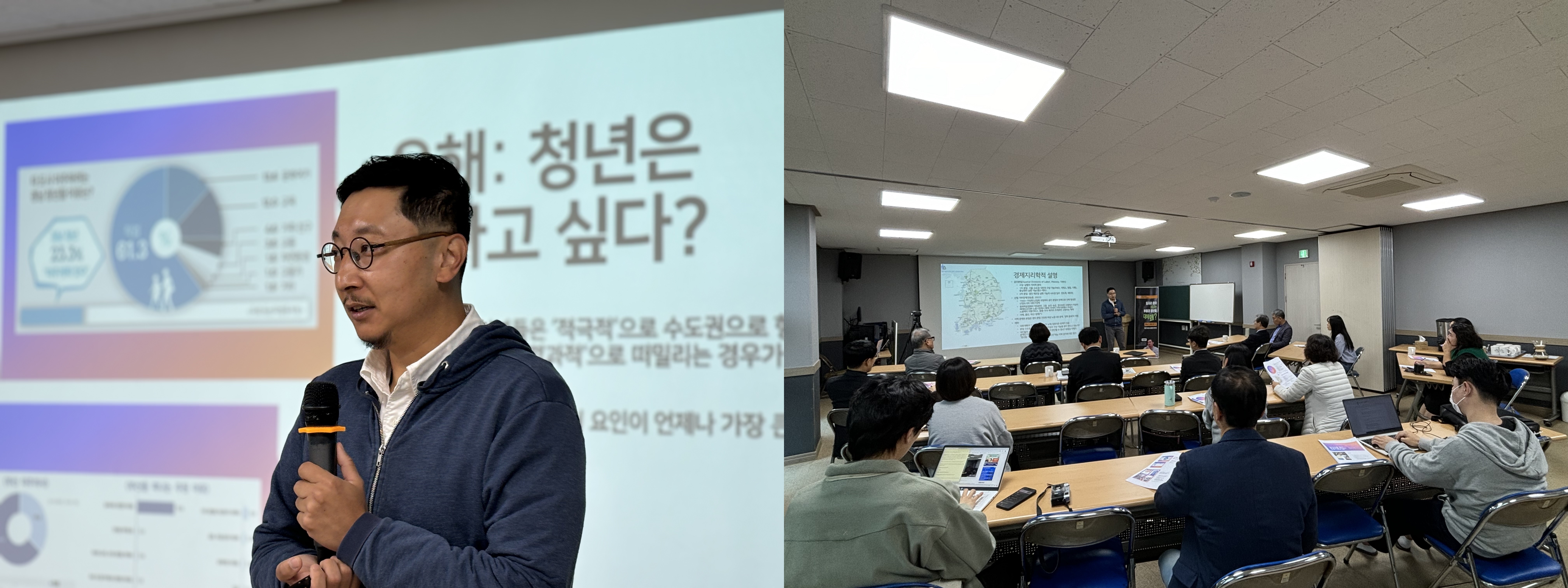 이날 강연은 ‘청년 과연 떠나고 싶을까?’, ‘경제지리학적 설명’, ‘지역의 청년 일자리 문제’, ‘지역의 여성 일자리’, ‘인구통계 해석’, ‘동남권 지역 정책 제안’ 순으로 이어졌습니다. 가장 인상 깊었던 부분은 지역 대학의 교수로서 가장 취업시키기 어려운 학생이 누구냐는 질문이었습니다.