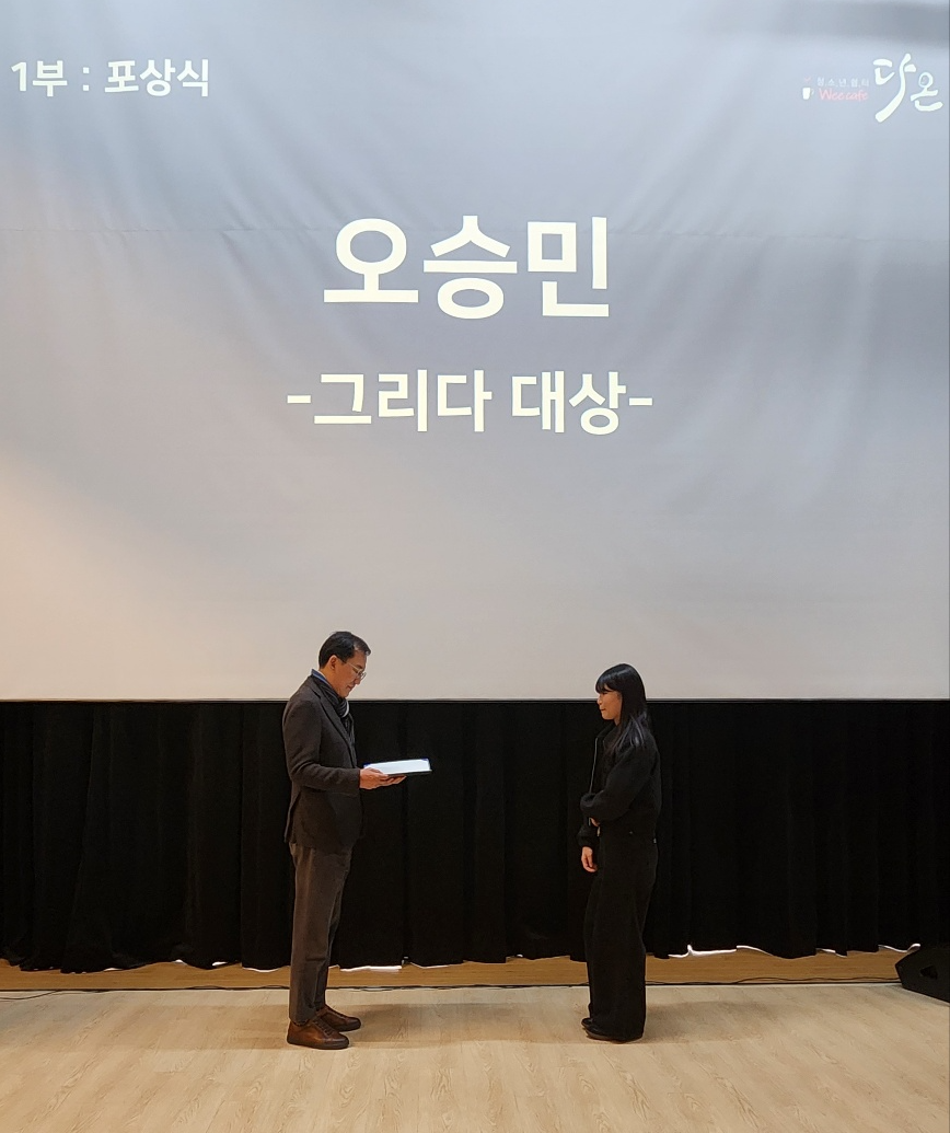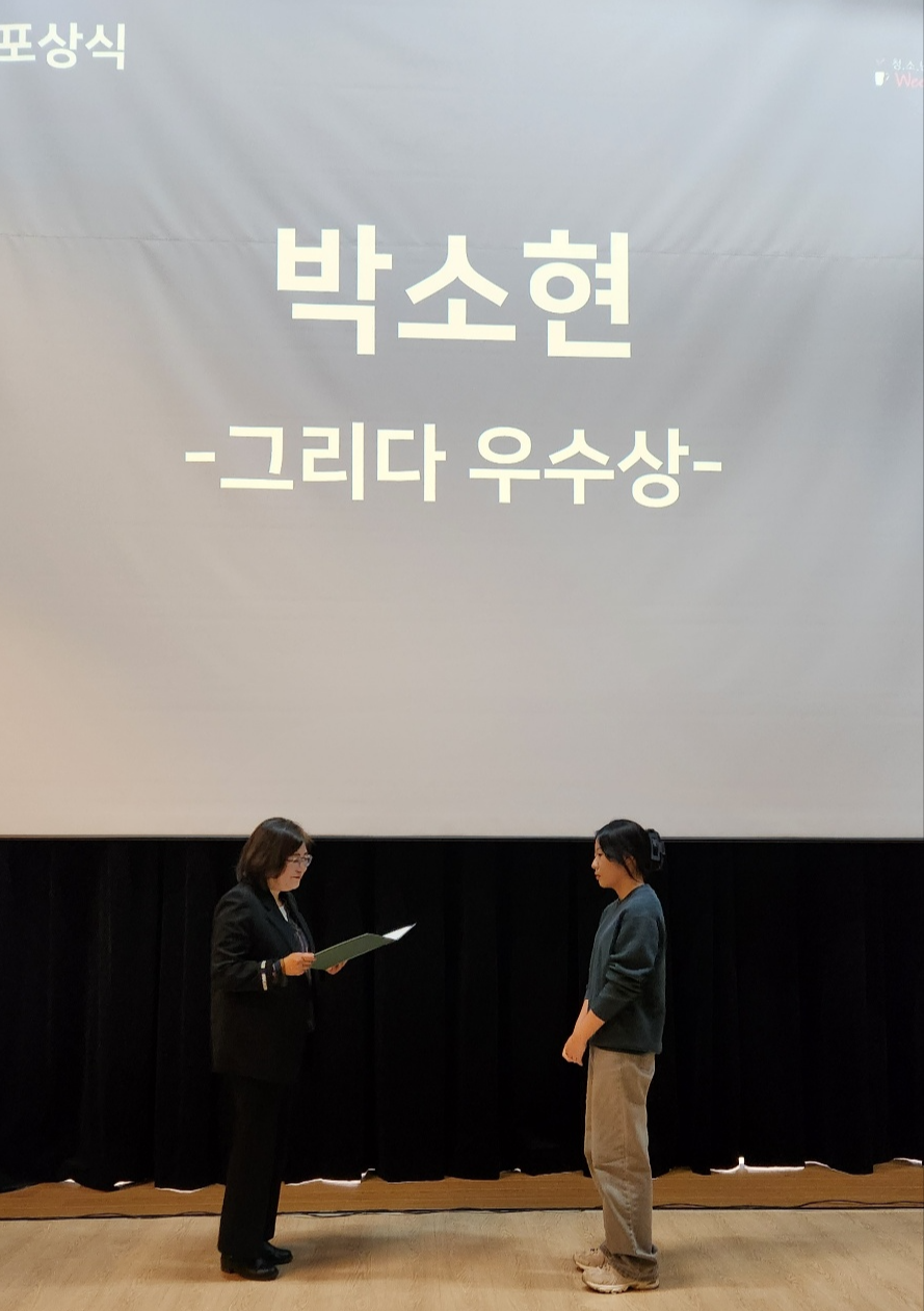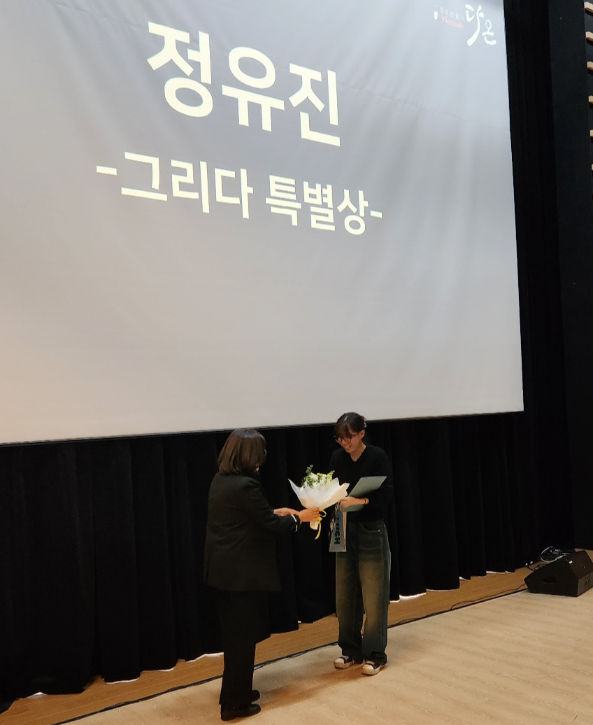 우수상은 박소현 선생님께서 수상하셨습니다. 박소현 선생님은 담다온 기자단 팀원으로 청소년 정보 제공을 위한 카드뉴스 제작 및 홍보와 그리다 활동영상 제작에 힘써주셨습니다.