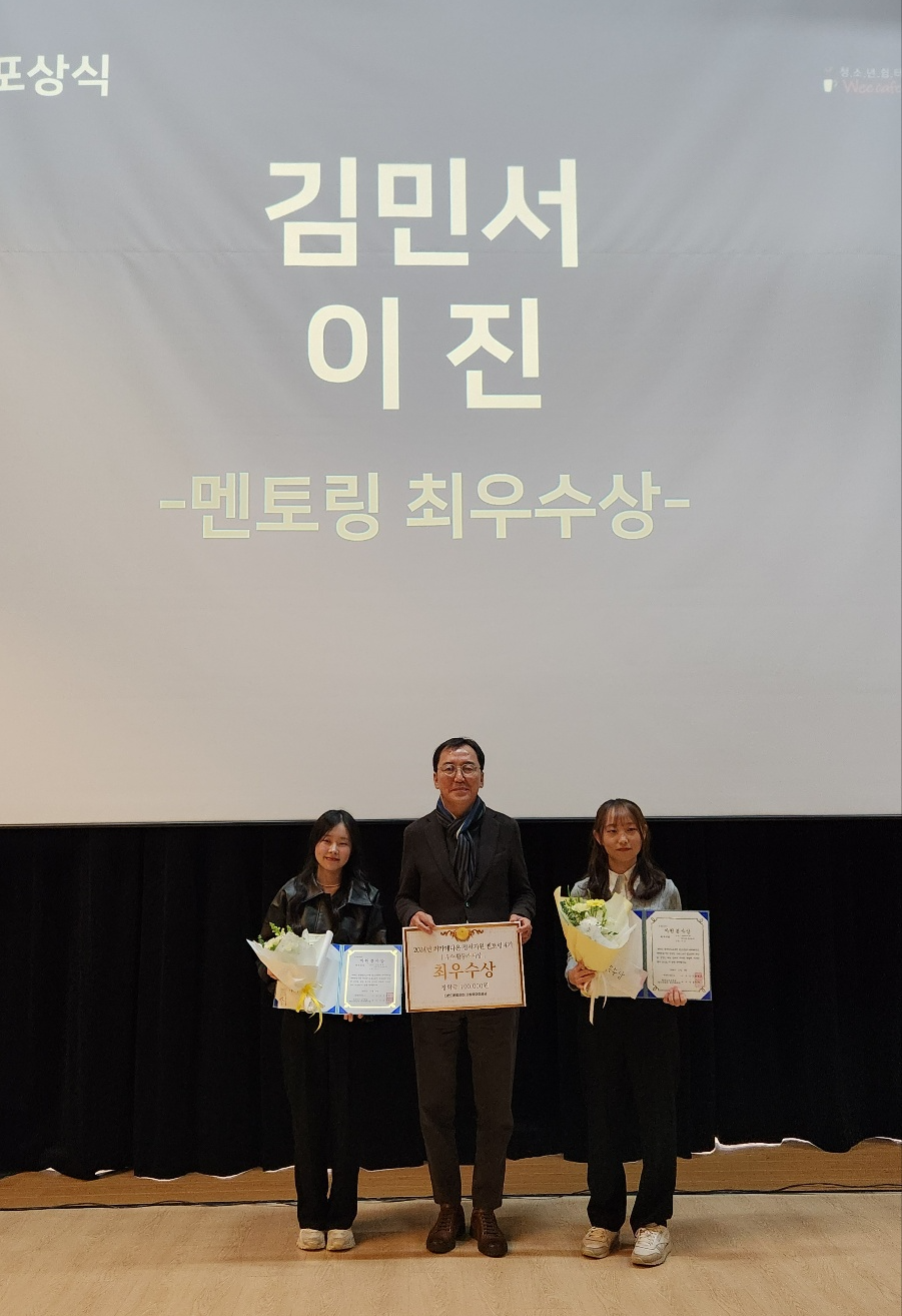 최우수상은 김민서, 이진 선생님께서 수상하셨습니다. 김민서 멘토는 학교 밖 멘티 청소년의 멘토로써 건강한 대인관계 형성 및 자기 탐색의 경험을 제공해주기 위해 자기 탐색 관련 활동을 진행함으로써 자기에 대한 혼돈이 있는 시기에 건강한 자아정체성을 확립할 수 있도록 도모해주었습니다.