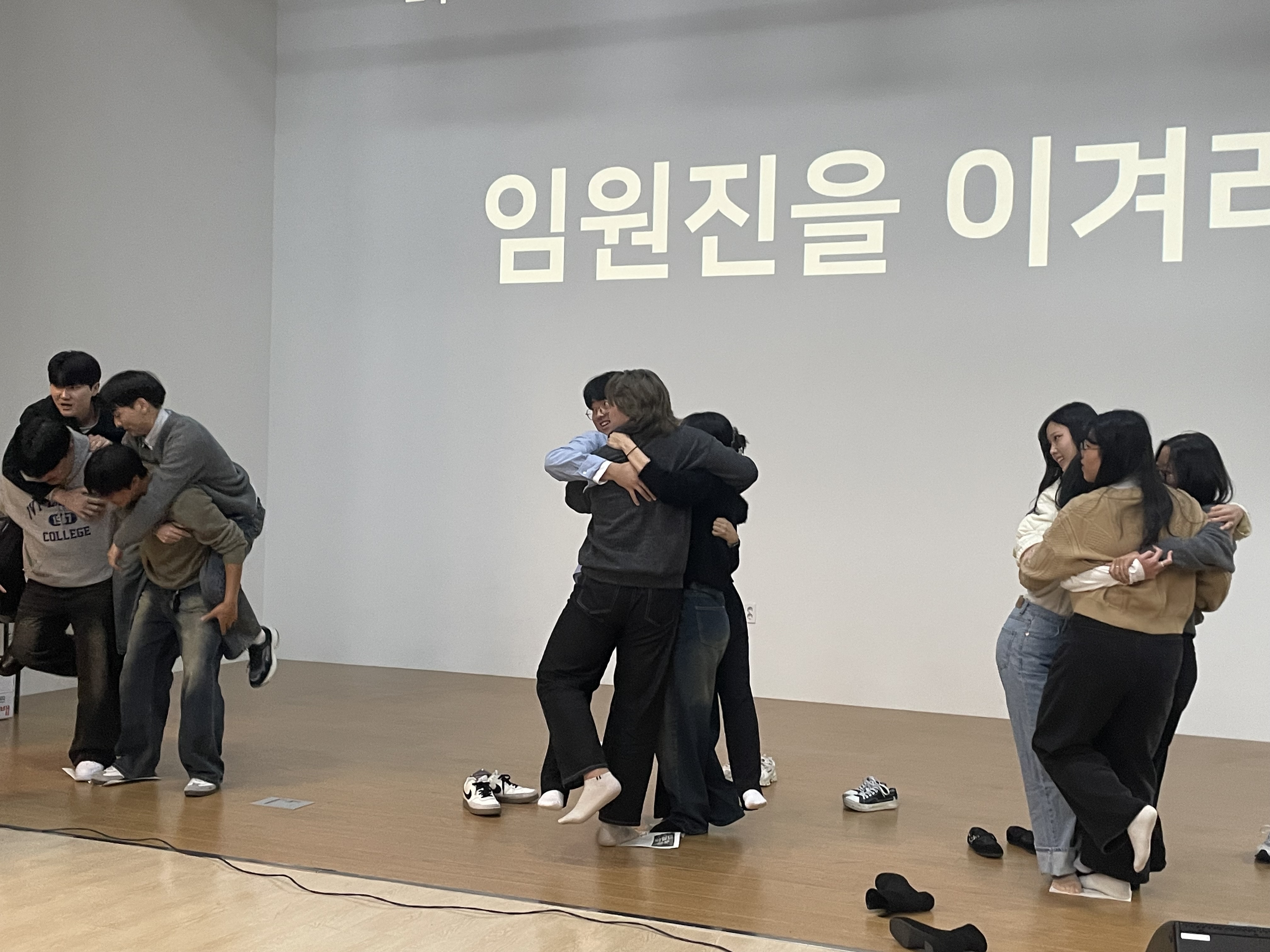 추첨 후에는 ‘임원진을 이겨라!’ 시간이 진행되었습니다. 그리다 임원진과 멘토링 임원진 선생님들이 준비한 코너입니다. 신문지 위에 올라가기, 청개구리 가위바위보, 한호흡 챌린지 등 임원진이 준비해주신 다양한 게임을 통해 모두 즐거운 시간을 보냈습니다.