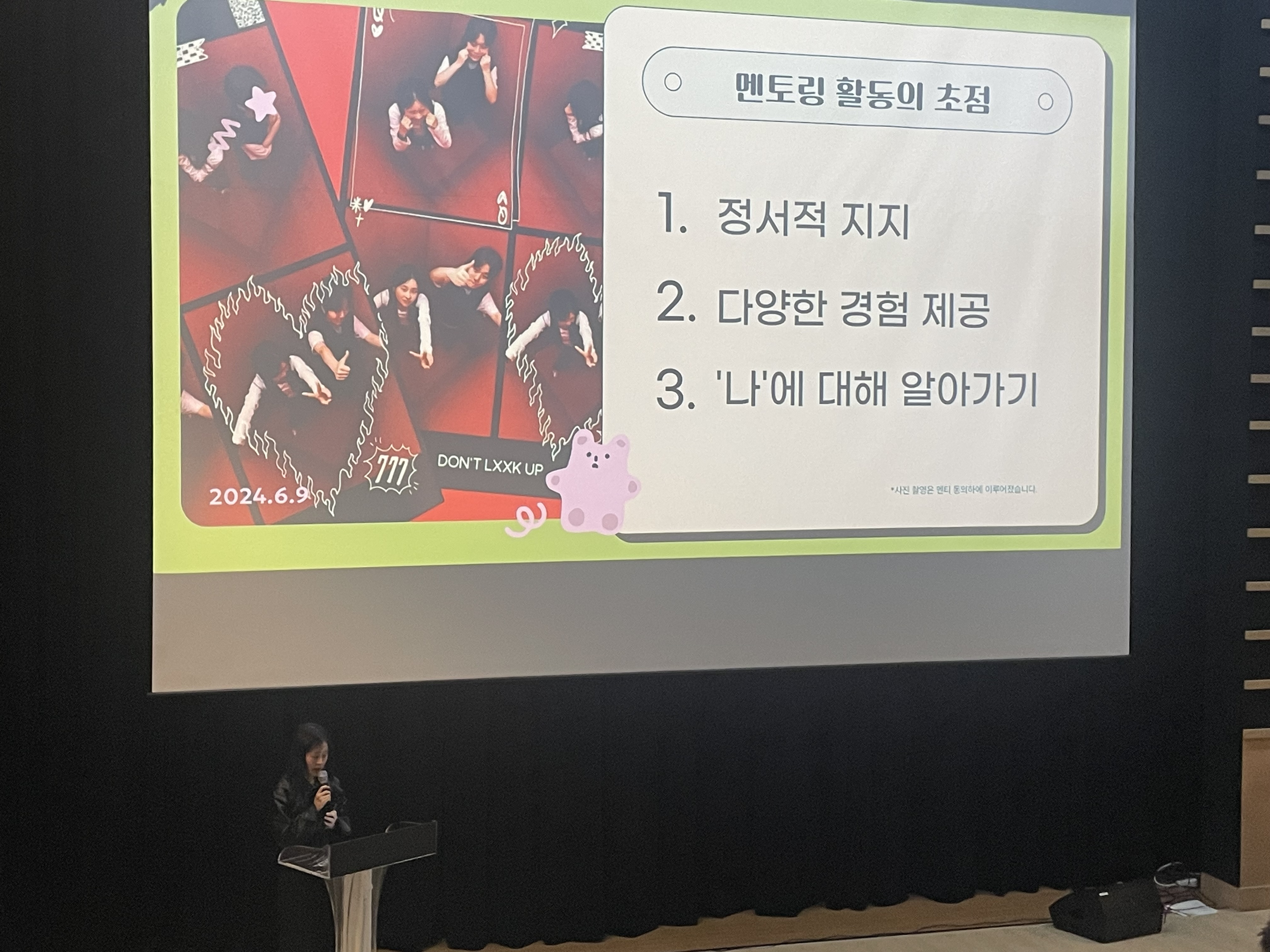 멘토링 맹새봄, 김민서, 이진 총 세 분의 대학생 멘토가 멘토링 사례 발표를 진행하였습니다. 발표를 통해서 멘토 선생님들이 멘티 청소년에게 다양한 경험을 제공하기 위해 많은 연구를 통해 활동을 진행함으로써 함께 성장해나간 과정을 알 수 있었습니다.