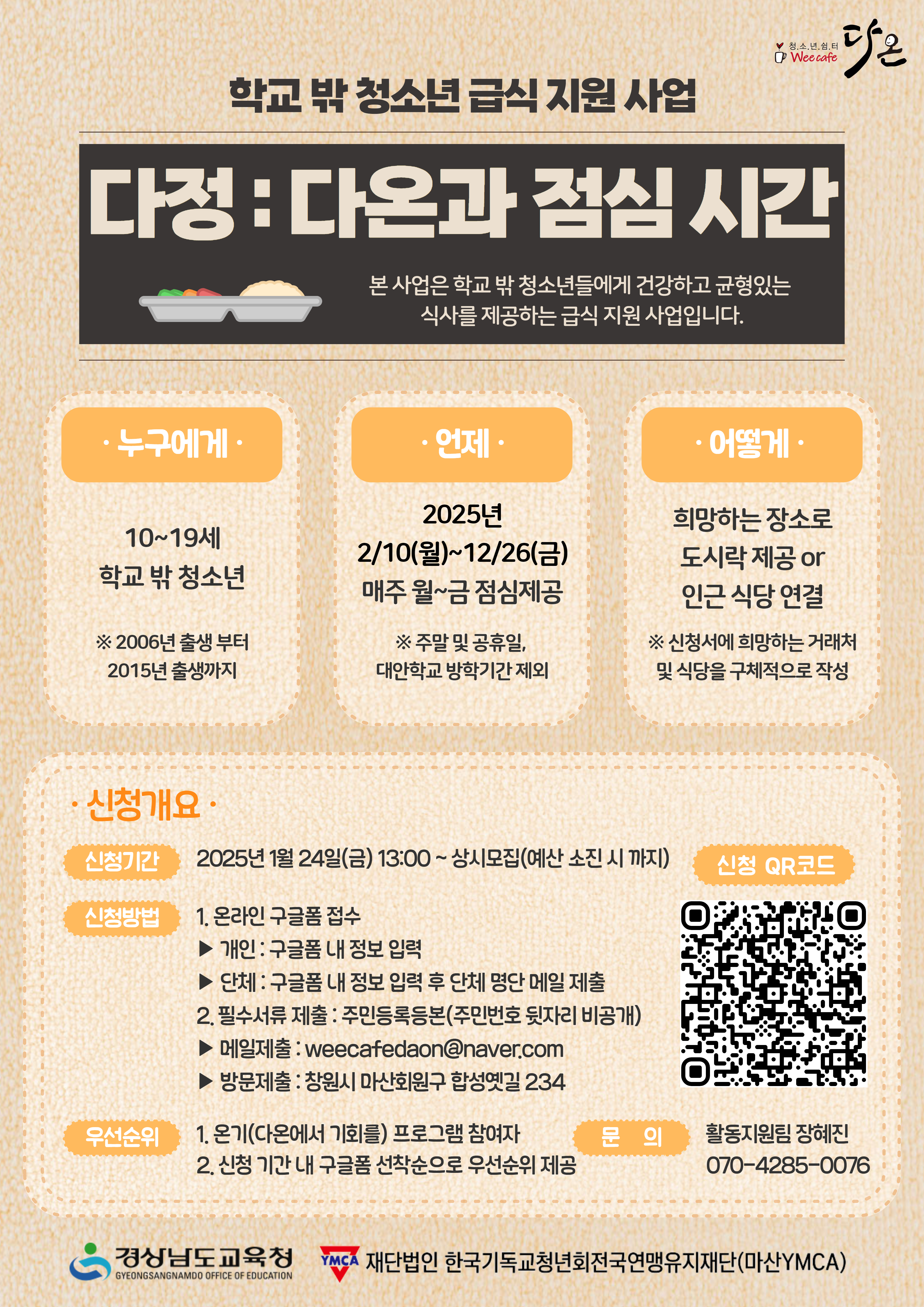 ‘다정’이라는 이름에는 특별한 의미가 담겨 있습니다. ‘다정’은 weecafe 다온과의 점심시간을 의미하며 급식이 단순한 식사가 아닌, 청소년들에게 따뜻하고 정다운 시간을 선물하고자 하는 마음을 담고 있습니다.