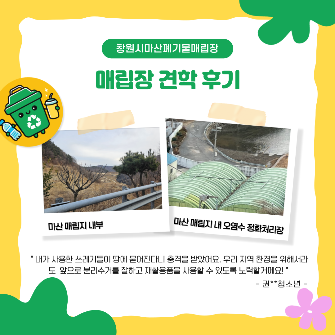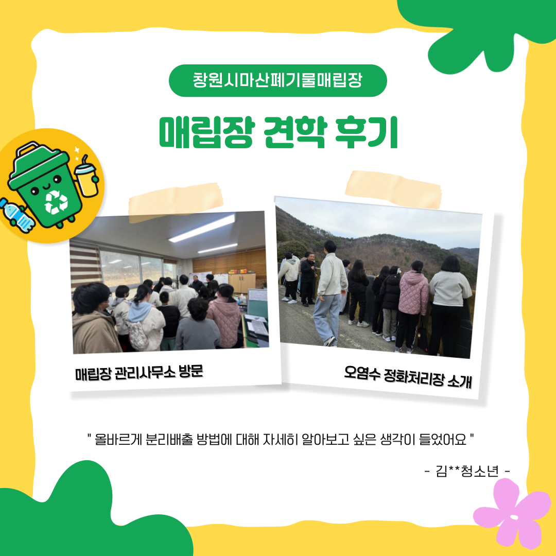 견학에 참여한 권**청소년은 “내가 사용한 쓰레기들이 여기로 와서 묻어진다니 충격을 받았으며, 앞으로 분리배출를 잘하여 재활용할 수 있도록 노력해야겠어요!”, 김**청소년은 “ 올바르게 분리배출하는 방법에 대해 자세히 알아보고 싶은 생각이 들어요”라고 소감을 남겼습니다.