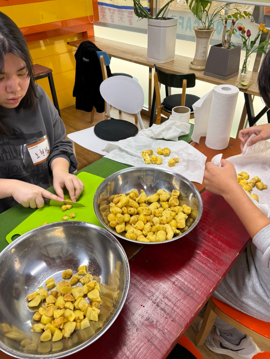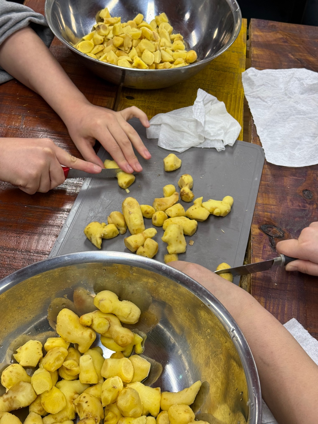 처음 생강껍질을 까보는 청소년들, 마트에서 늘 까져 있는 생강만 보다가