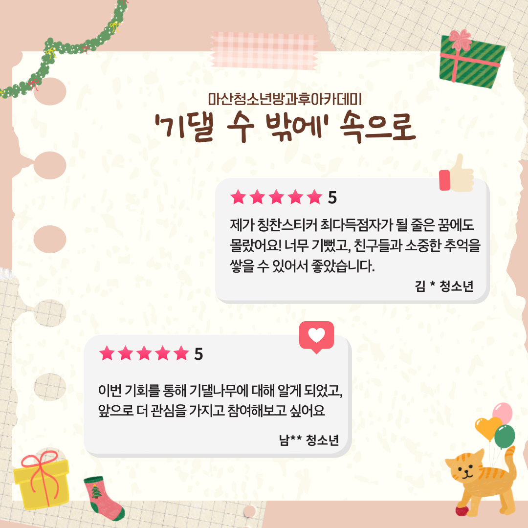 행사에 참여한 김* 청소년은 "제가 칭찬스티커 최다득점자가 될 줄은 꿈에도 몰랐어요! 너무 기뻤고, 친구들과 소중한 추억을 쌓을 수 있어서 좋았습니다."라고 소감을 밝혔습니다. 처음 기댈나무를 방문한 남** 청소년은 "이번 기회를 통해 기댈나무에 대해 알게 되었고, 앞으로 더 관심을 가지고 참여해보고 싶어요."라는 반응을 보였습니다.