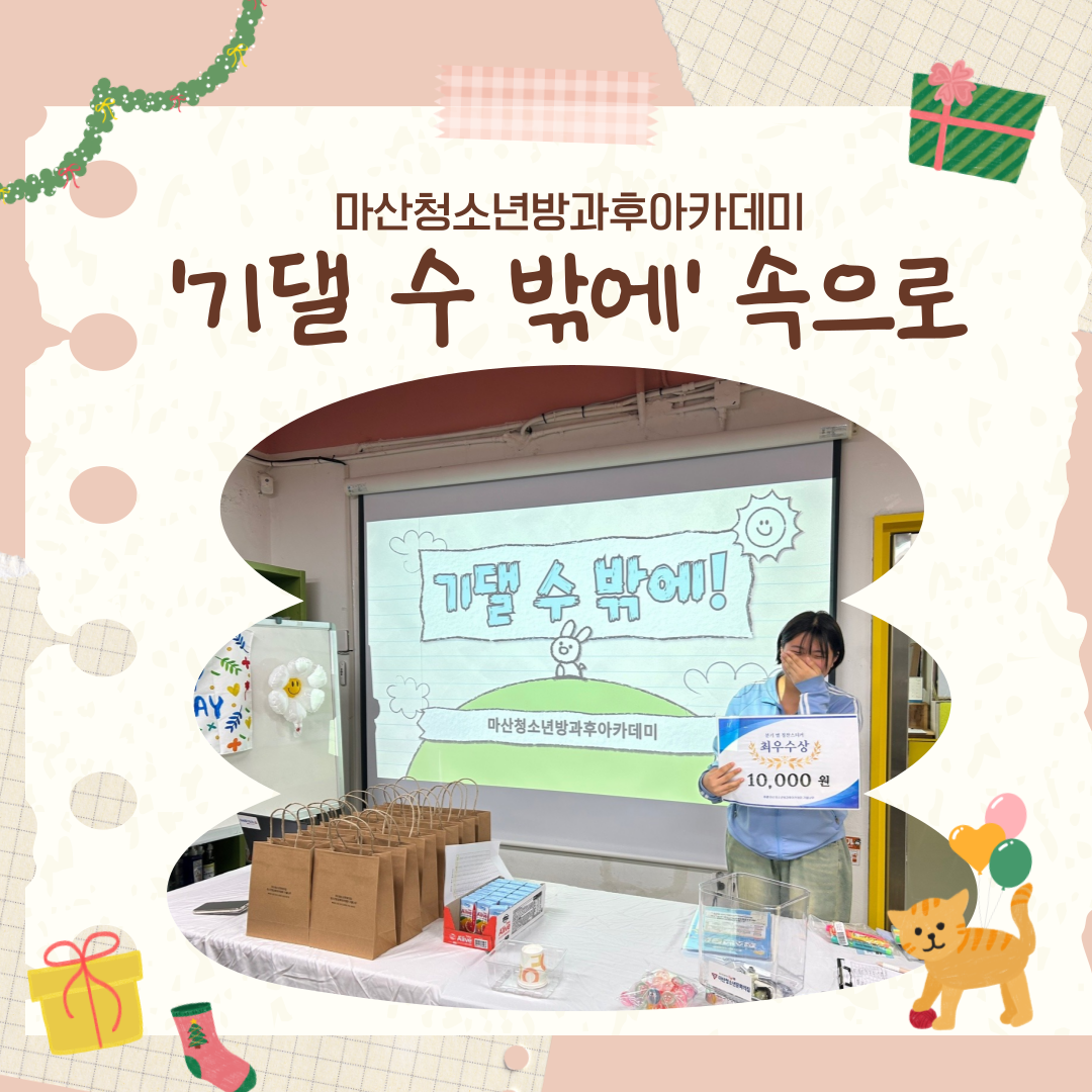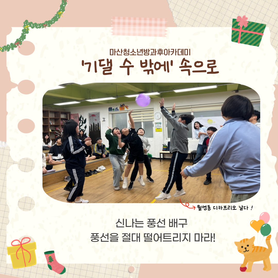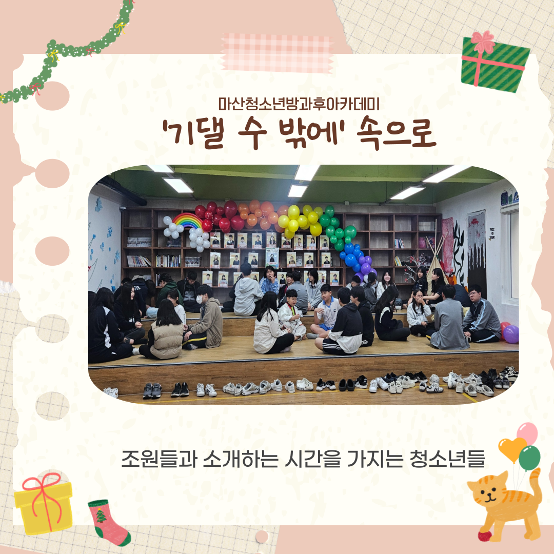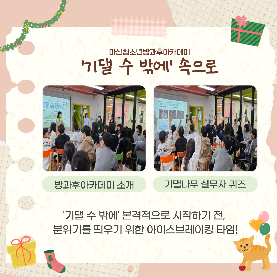 3월 26일, 기댈나무에서는 1분기 "기댈 수 밖에" 행사를 개최했습니다. 이번 행사에서는 기댈나무 청소년들이 자신의 친구들을 초청하여 방과후아카데미를 소개하고, 다양한 게임과 맛있는 먹거리를 함께 즐기며 뜻깊은 시간을 보냈습니다.