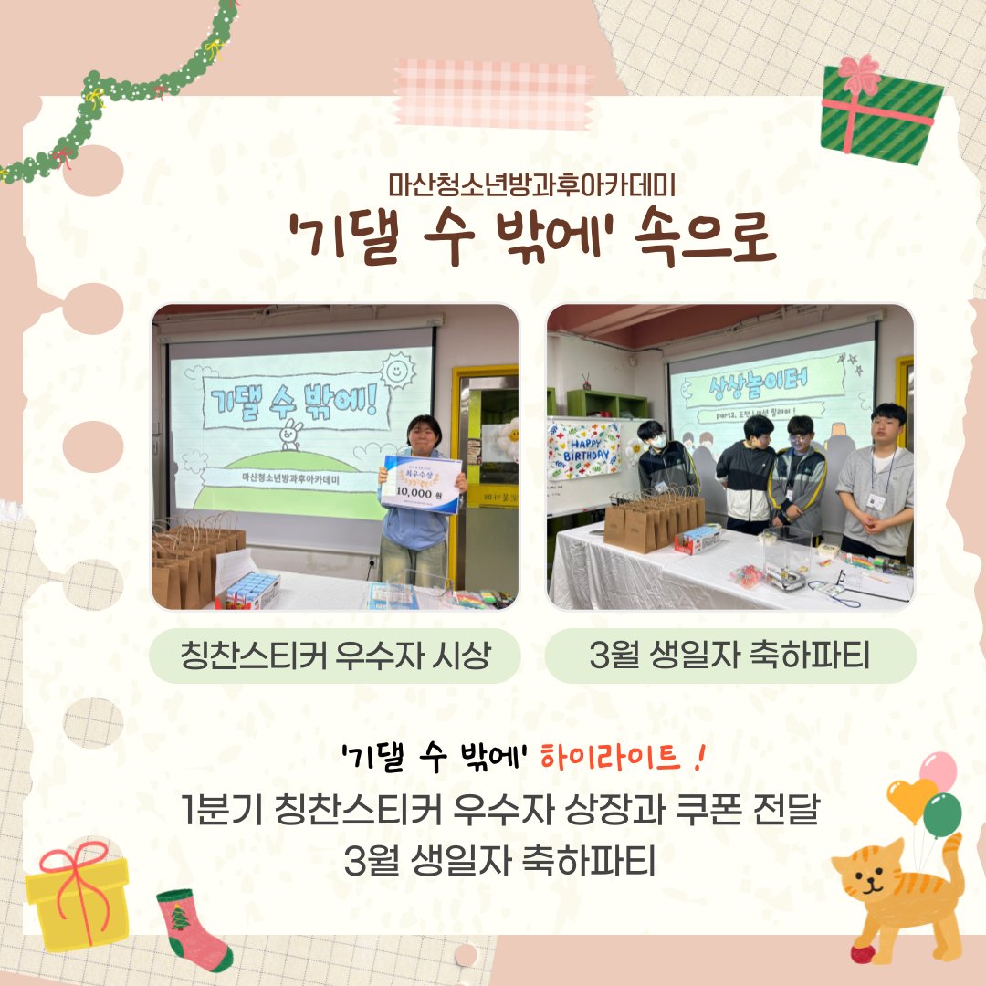 또한, 기댈나무를 알리고 즐거운 시간을 보내는 것에 그치지 않고, 3월 생일을 맞은 친구들의 생일을 함께 축하하는 시간도 가졌습니다. 더불어, 1분기 칭찬스티커 최다득점자에게는 상장과 함께 만 원 상당의 선물을 받을 수 있는 쿠폰도 전달되었습니다.