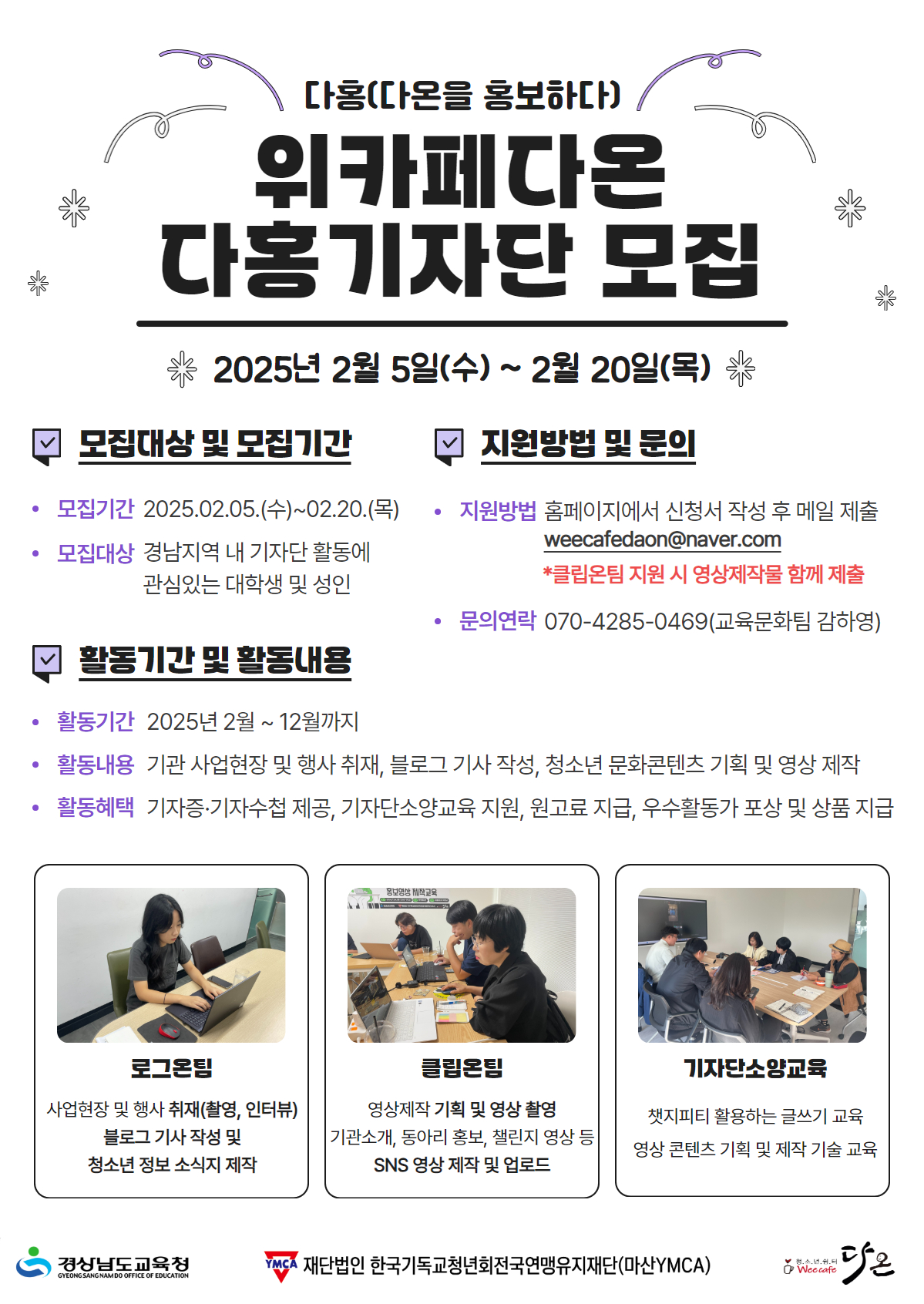 다홍은 '다온을 홍보하다'라는 뜻으로 사진, 영상, 글 다양한 방식으로 위카페다온을 홍보하는 기자단입니다. 다홍기자단은 매년마다 위카페다온의 사업과 다양한 행사들을 홍보하여 위카페다온을 지역사회에 알리는 데에 큰 역할을 하고 있습니다. 올해의 다홍 기자단은 3년째 다홍 기자활동에 힘써주시는 분들부터 입소문을 타고 새롭게 지원하신 분들까지 다양한 기자님들께서 지원해주셨고, 총 7명의 기자님들이 다온과 2025년을 함께 하기로 했습니다.