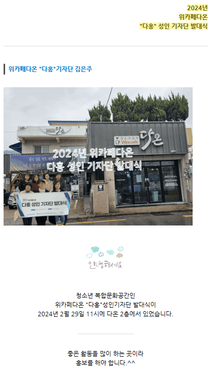 위카페다온은 지난 2월 5일부터 2월 20일까지 다홍기자단을 모집하여 3월 5일, 다홍기자단 발대식을 진행하였습니다!