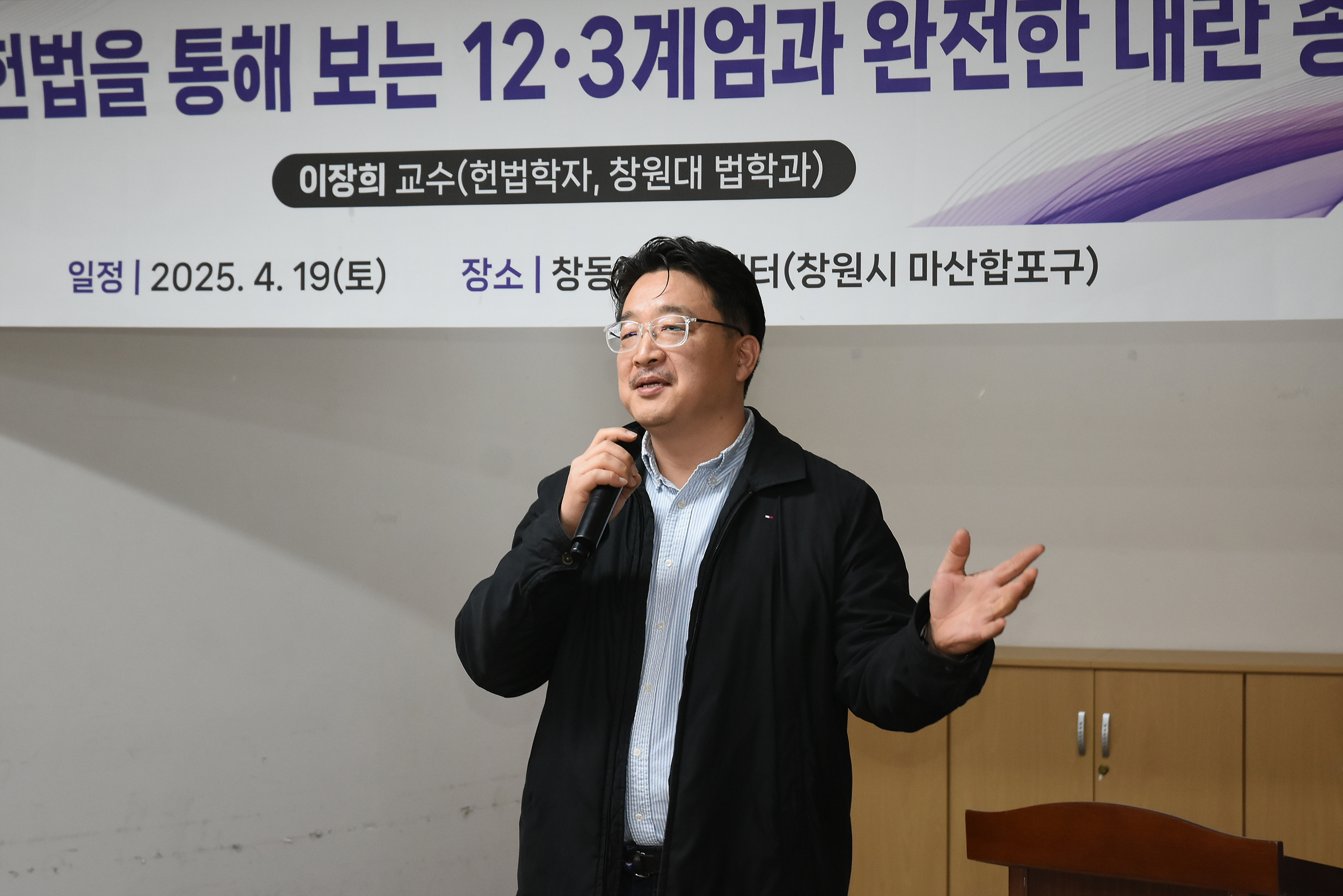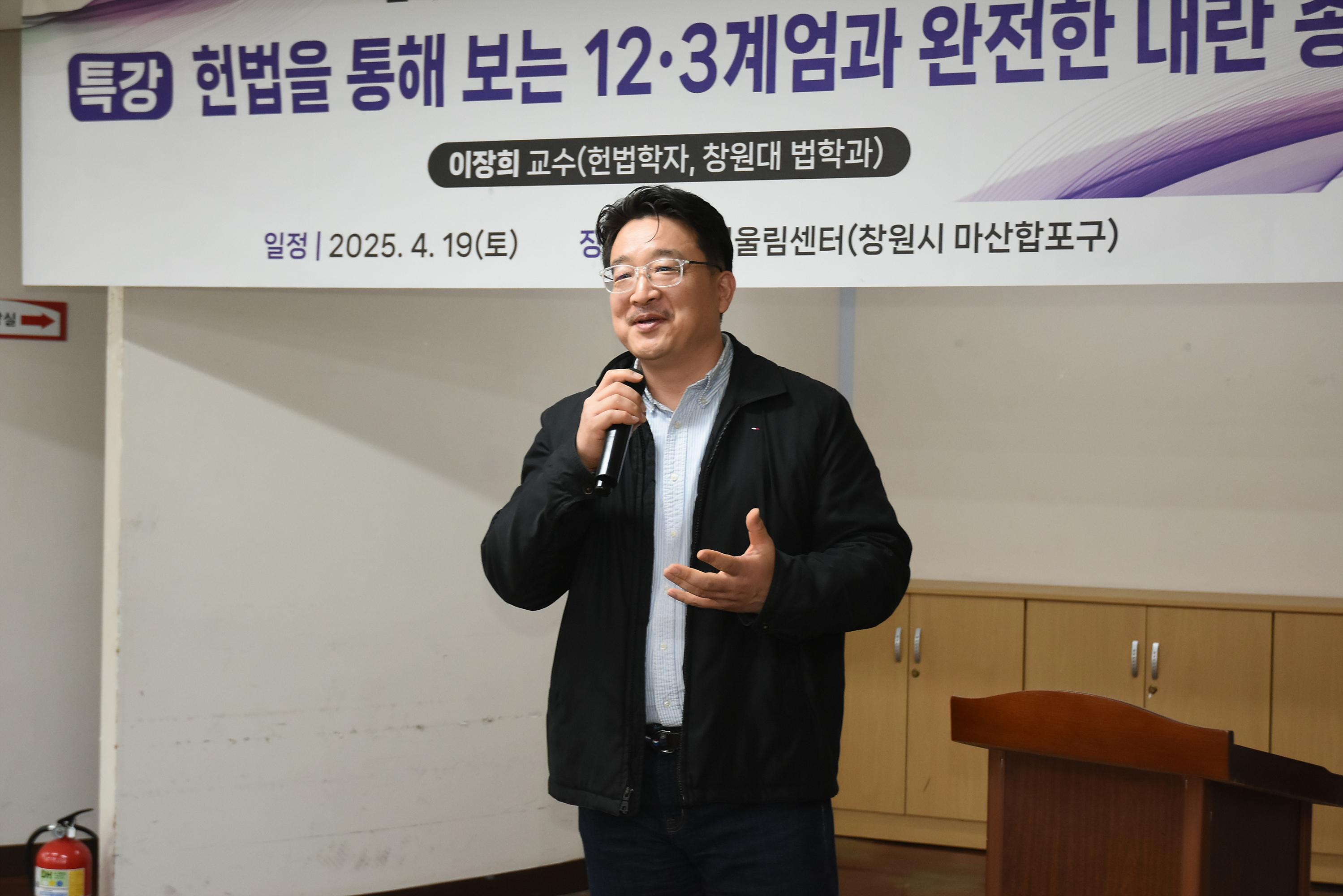 <헌법을 통해 보는 12.3 계엄과 완전한 내란 종식>을 주제로 창원대학교 이장희 교수를 초대하여 특강을 들었는데요. 이장희 교수는 12.3 계엄 사태를 헌정사의 여섯 번째 내란으로 규정하면서, 마지막 내란 이후에 약 45년 만에 여섯 번째 내란이 발생한 것은 앞선 다섯 번의 내란 처벌에 실패하였기 때문이라고 강조하였습니다. 아울러 "민주주의 헌법을 만든 민주화 운동의 정신이 12.3 내란을 막아낸 원동력"이었으며, "우리 헌법에 고쳐야 할 부분이 없는 것은 아니지만, 헌법을 무시하고 침해하는 권력자와 국민주권과 민주주의에 대한 인식이 부족한 사람"의 문제도 적지 않다고 주장하였습니다. "바이러스를 이기려면 저항력이 잇어야 하는 것처럼, 헌정을 지속하기 위해서는 헌법 교육, 역사교육, 민주주의 교육이 지속적으로 이루어져야 한다" 거듭 강조하였습니다.