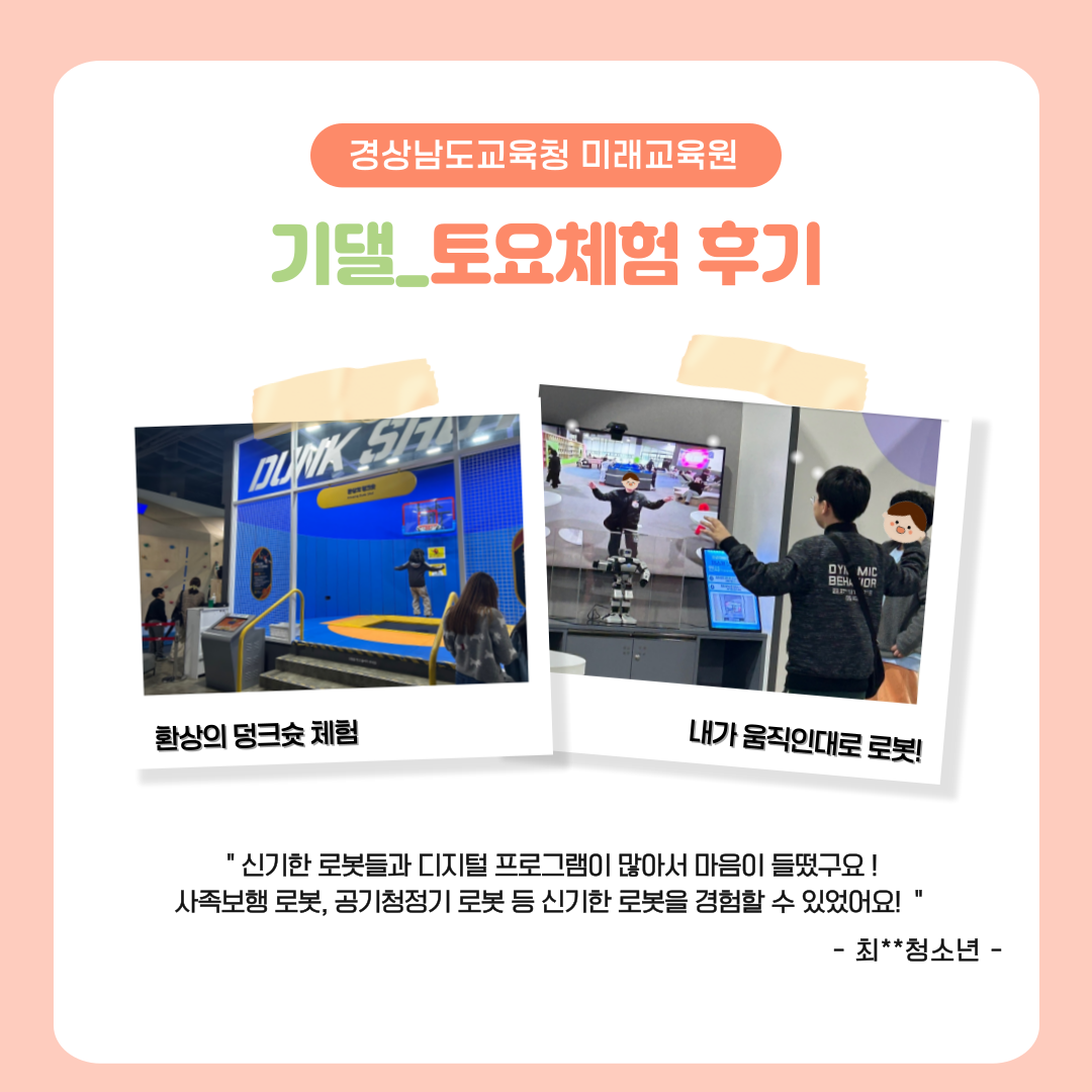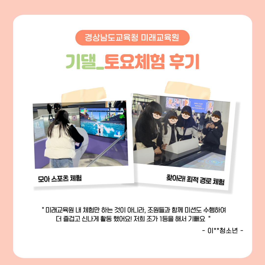 토요체험에 참여한 이**청소년은 “미래교육원 내 체험만 하는 것이 아니라, 조원들과 함께 미션도 수행하여 더 즐겁고 신나게 활동 했어요! 저희 조가 1등을 해서 기뻐요”, 최**청소년은 “신기한 로봇들과 디지털 프로그램이 많아서 마음이 들떴구요! 사족보행 로봇, 공기청정기 로봇 등 신기한 로봇을 경험할 수 있었어요!”라고 소감을 남겼습니다.