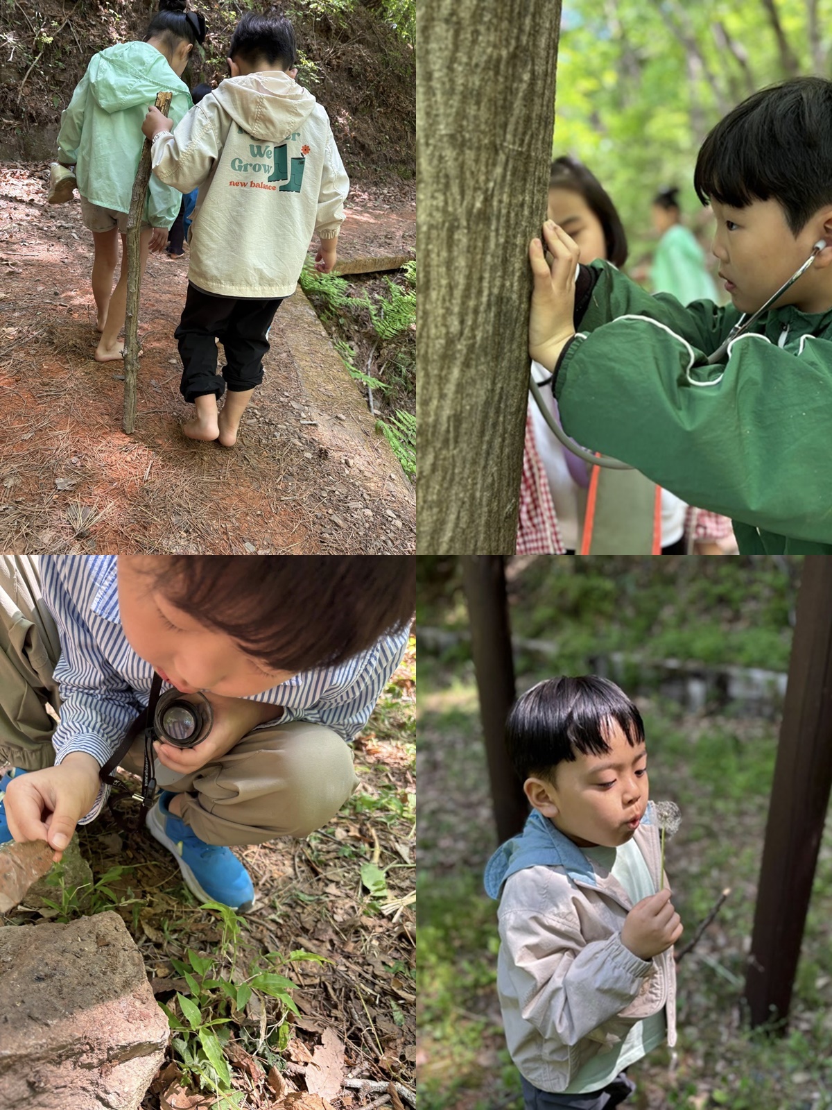또 다른 도전으로는 탁구공 놀이에 도전했습니다. 쉽지 않은 놀이였지만, 아이들은 아쉬워하기보다는 다음 달에 다른 빨대를 준비해 다시 도전해보기로 약속했습니다. 산림욕장 주변은 멋진 숲속 산책길로 이어져 있었습니다. 작고 구불구불한 오솔길을 걸으며 봄 산의 싱그러움을 마음껏 느낄 수 있었습니다.