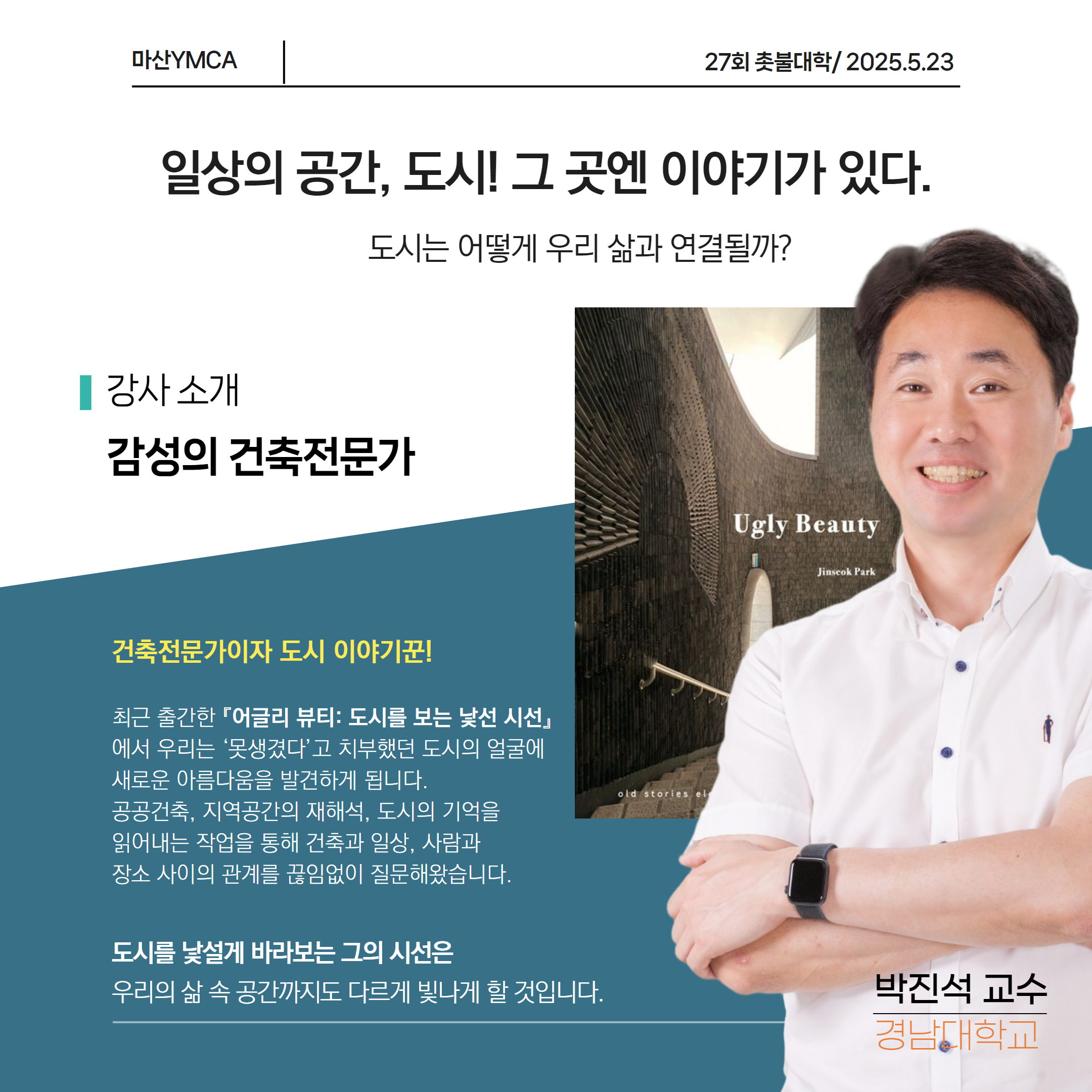 도시의 일상과 풍경을 감성적으로 바라보는 시선, ‘Ugly Beauty’ 저자 박진석 교수와 함께 도시의 얼굴에 숨어 있던 공간의 기억과 사람의 이야기를 만나봅니다.