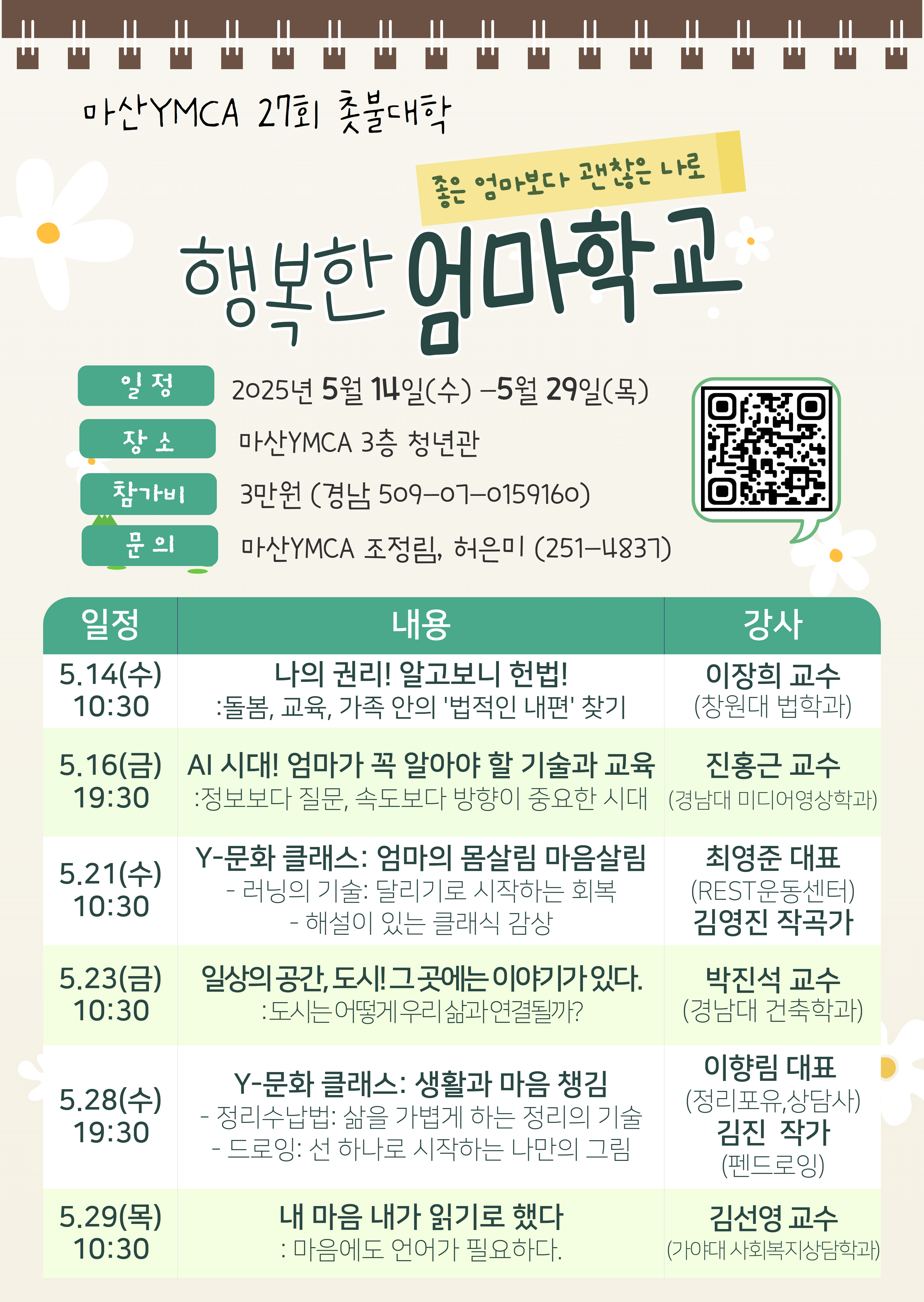 마산YMCA 제27회 촛불대학 “행복한 엄마학교” 참가자를 모집합니다!