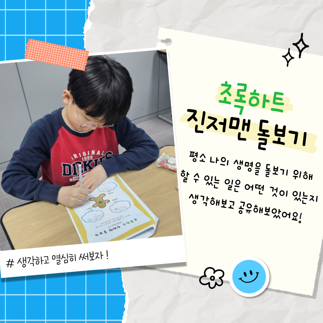이어서, 빨간 하트 진저맨 활동에서는 “죽고 싶을 만큼 힘든 순간이 온다면, 나는 나의 생명과 마음을 어떻게 돌볼 수 있을까?”를 주제로 생각을 나누었습니다. 아이들은 “믿을 수 있는 선생님에게 말하기”, “슬플 땐 울어도 괜찮다는 걸 기억하기”, “마음을 달래주는 노래 듣기” 등 자신만의 방법을 적어가며 스스로를 돌보는 법을 배워갔습니다.