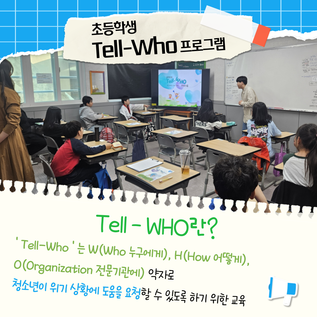 ‘Tell-WHO’는 W (Who: 누구에게), H (How: 어떻게), O (Organization: 전문기관에)라는 약자로, 도움을 요청할 수 있는 방법을 배우는 교육으로, 아이들이 위기 상황에서 혼자 고민하지 않고 주변에 알리고, 연결하고, 도움을 받을 수 있도록 돕기 위한 프로그램입니다.