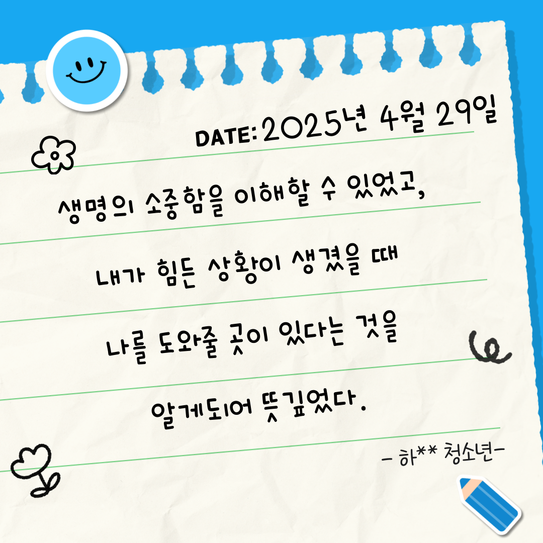 이번 프로그램을 통해 아이들이 자신의 생명과 마음을 더욱 소중히 여기며, 어려운 순간에도 혼자가 아니라는 걸 기억할 수 있기를 바랍니다.