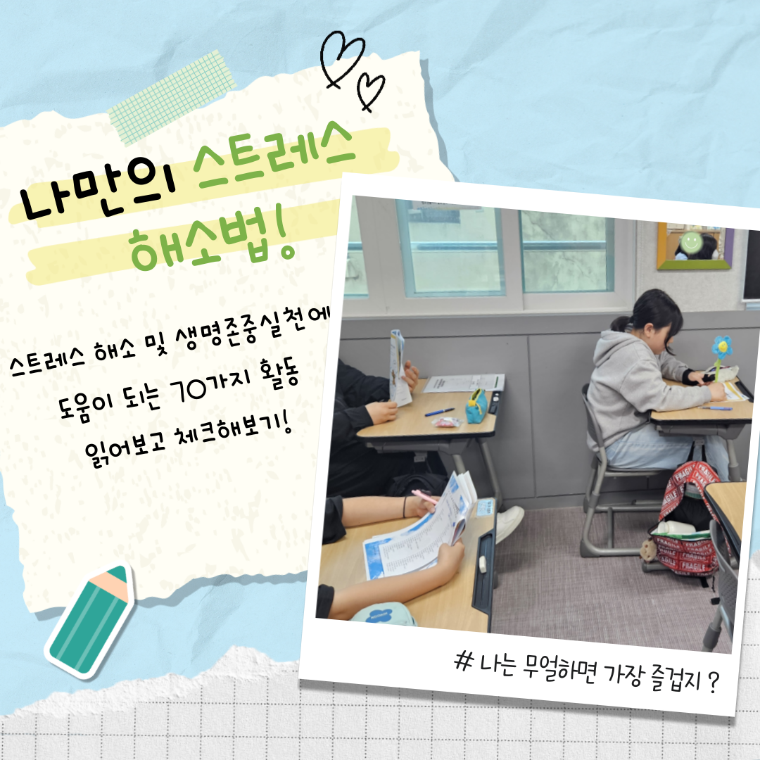 또, 스트레스를 해소하고 생명존중을 실천할 수 있는 70가지 활동도 함께 살펴보았는데요, 단순히 재미있는 놀이를 넘어서, 감정을 다스리고 일상 속에서 자기 자신을 챙기는 소중한 시간이 될 수 있다는 것을 함께 느껴보았습니다.