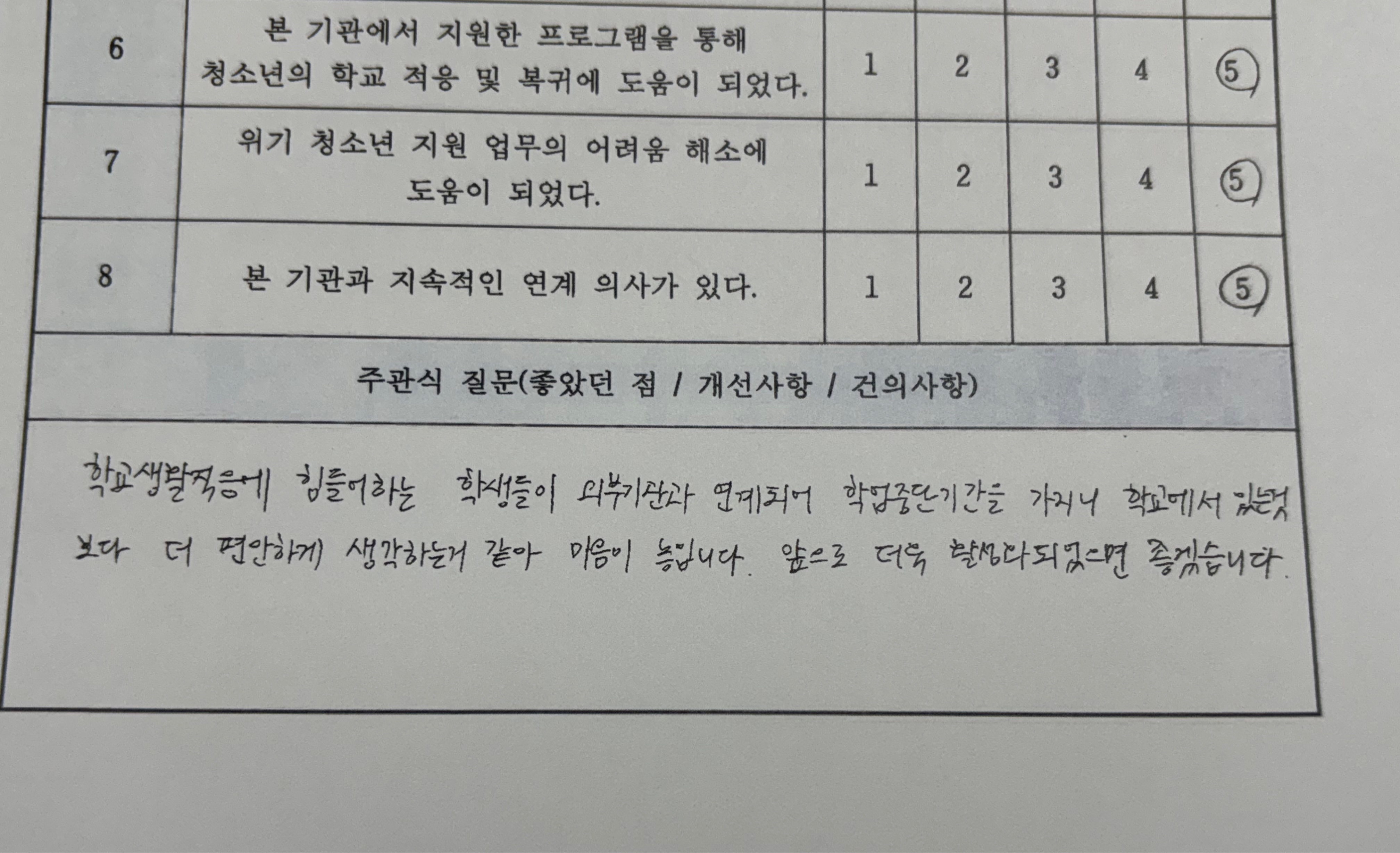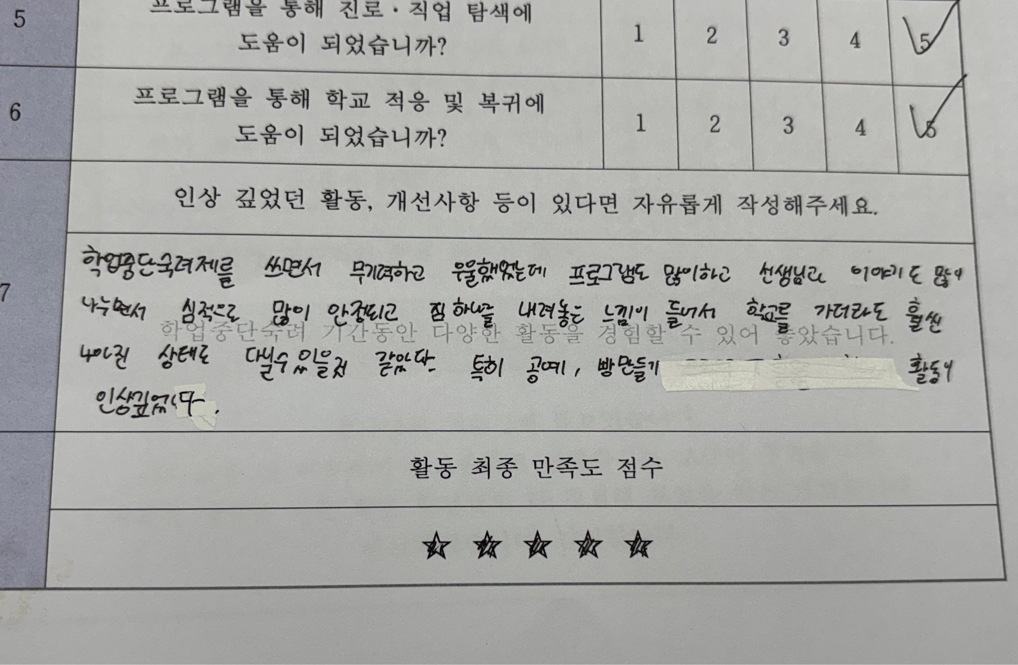 학교생활적응에 힘들어하는 학생들이 외부기관과 연계되어 학업중단기간을 가지니