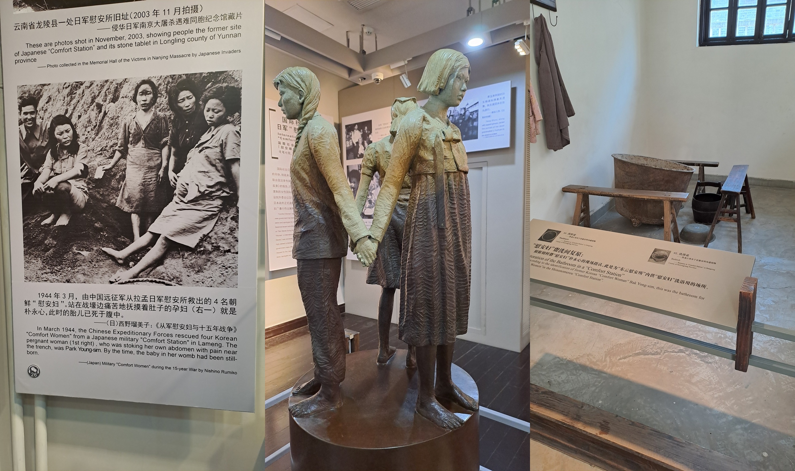 위안소 입구에 들어서자 마주한 ‘통곡의 벽’에 위안부 피해자 할머니들의 얼굴을 마주하자 발걸음이 무거워졌다. 그리고 임신한 박영심 할머니의 동상에서 걸음을 멈췄다. 우리 국민이 피해자인데 정작 우리나라에는 왜 이런 진열관도 없고, 소녀상 하나 세우는것도 일본의 눈치를 보는건지 화가났다. 중국은 정부가 나서서 피해자들의 증언을 듣고, 시민들에게 ‘잊어선 안된다’며 의무적으로 가르치고 강조하며, 시민들은 이런 현장을 찾아 끊임없이 배우고 나누는데... 2015년에는 말도 안되는 협상안을 들고와 할머니들을 모욕했다. 생각하니 또 화가난다.
