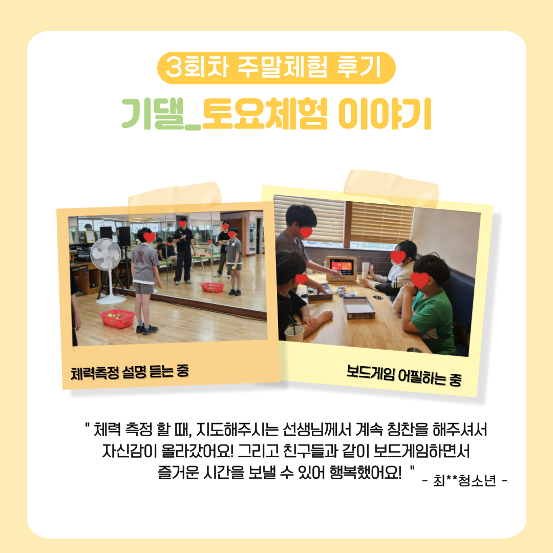 이번 주말 체험 활동은 자신의 체력 상태를 객관적으로 이해하고, 진로에 대한 진지한 고민을 해보는 뜻깊은 시간이었으며, 편안하고 즐거운 분위기 속에서 소통과 유대감까지 쌓을 수 있는 의미 있는 하루가 되었습니다.