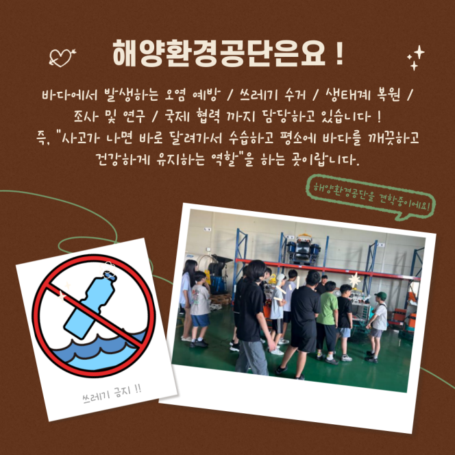 해양환경공단은 바다에서 발생하는 오염 예방, 쓰레기 수거, 생태계 복원, 조사 및 연구, 국제 협력까지 담당하고 있습니다. 즉, 사고가 나면 바로 달려가서 수습하고 평소에 바다를 깨끗하고 건강하게 유지하는 역할을 하는 곳이죠!