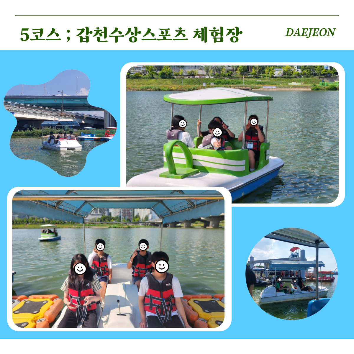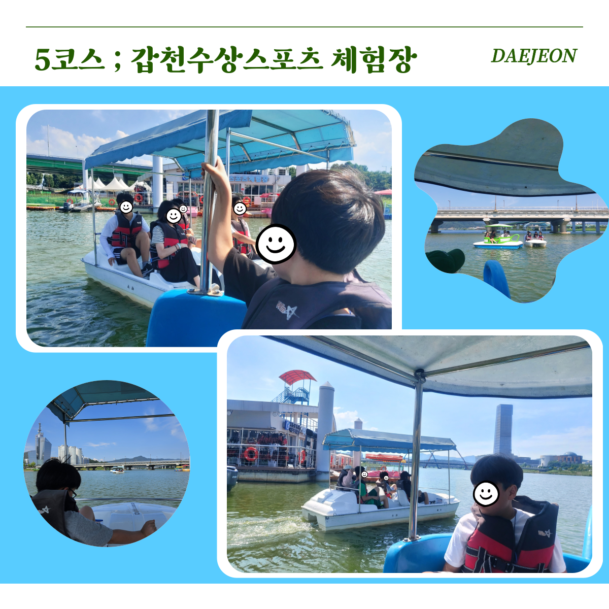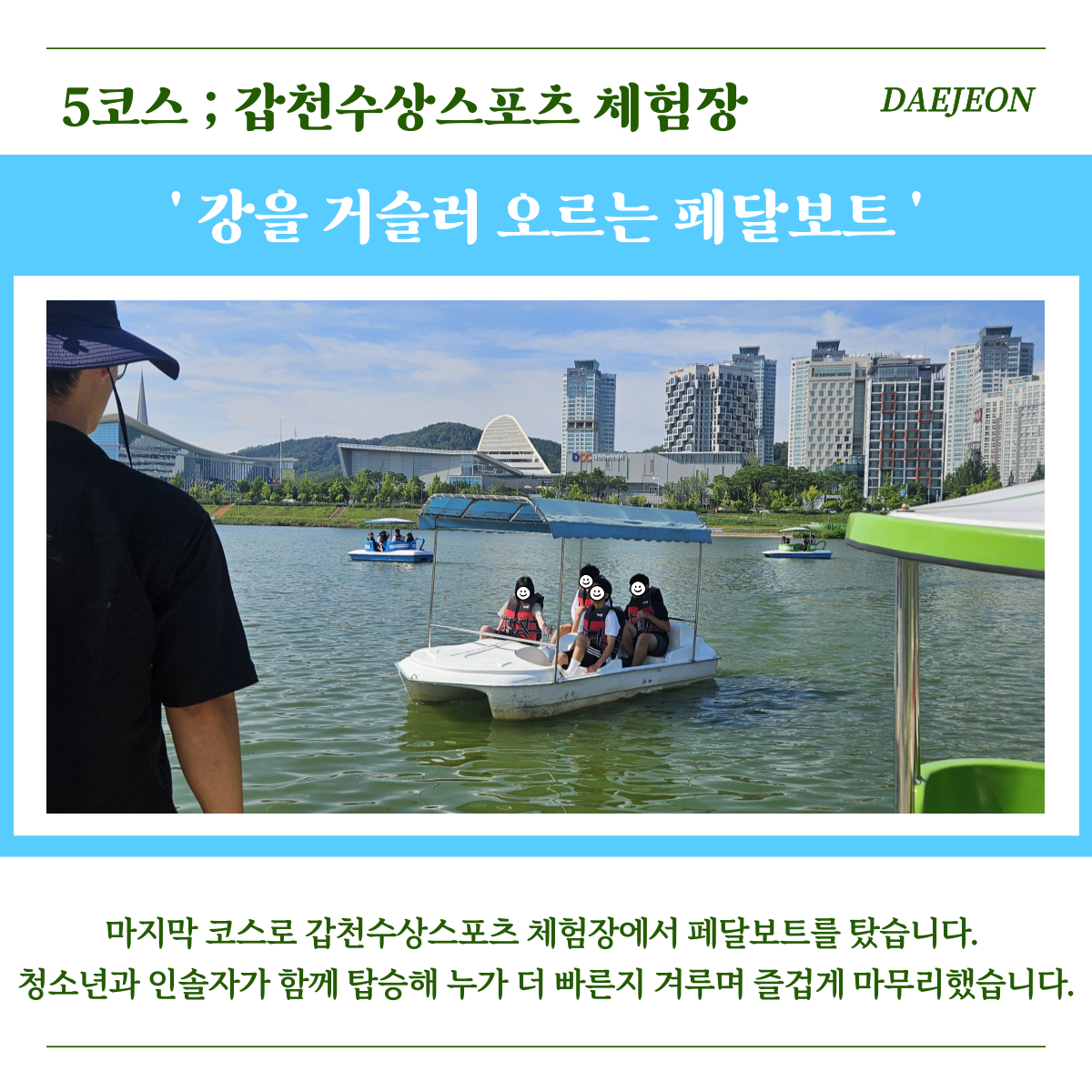 마지막 코스로 갑천수상스포츠 체험장에 방문하였습니다. 청소년들은 페달보트를 직접 조종하며 힘을 합쳐 앞으로 나아갔고, 팀별로 작은 경주도 펼쳐지며 즐거운 시간을 보냈습니다. 물 위에서 느낄 수 있는 시원한 바람 덕분에 하루의 피로도 잠시 잊을 수 있었습니다.