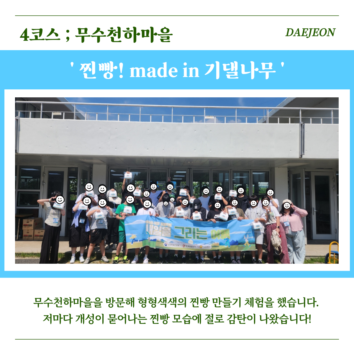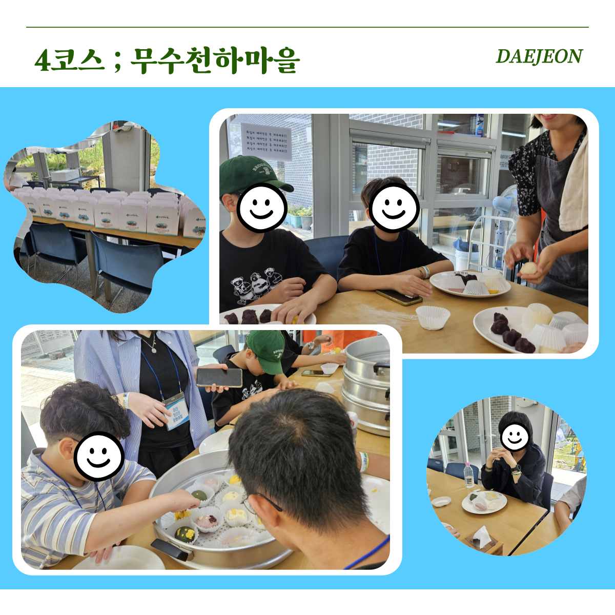무수천하마을은 대전의 자연 속에서 전통문화를 직접 체험할 수 있는 마을로, 찐빵 만들기와 전통 음식, 농촌 활동 등을 즐길 수 있는 곳입니다. 이번에 기댈나무 청소년들은 찐빵 만들기에 도전했는데요. 직접 반죽을 빚고 모양을 내며 각자의 개성이 담긴 찐빵을 완성했습니다.