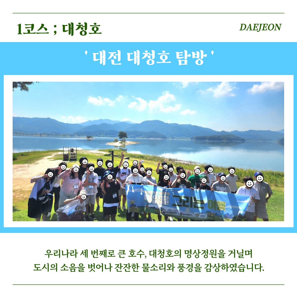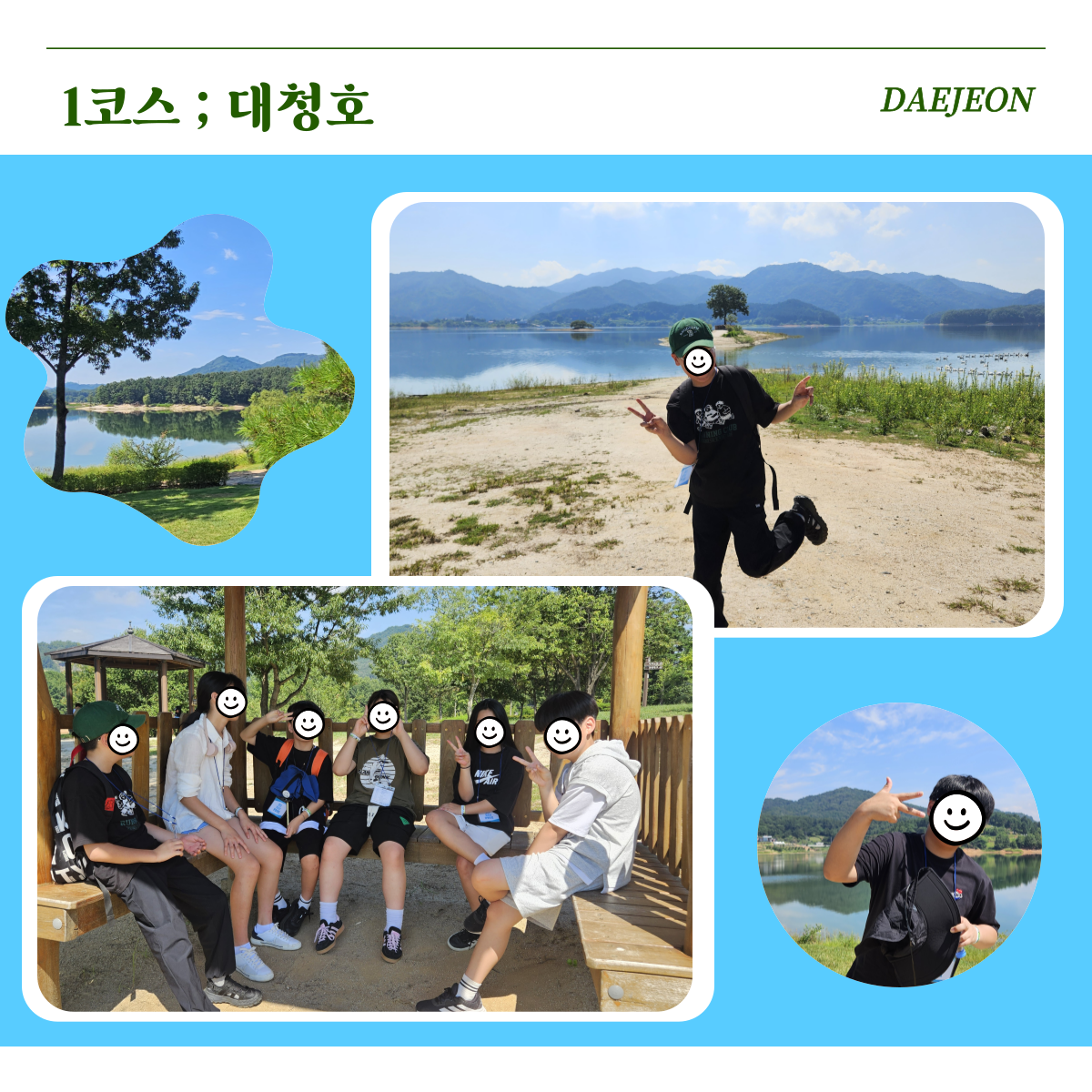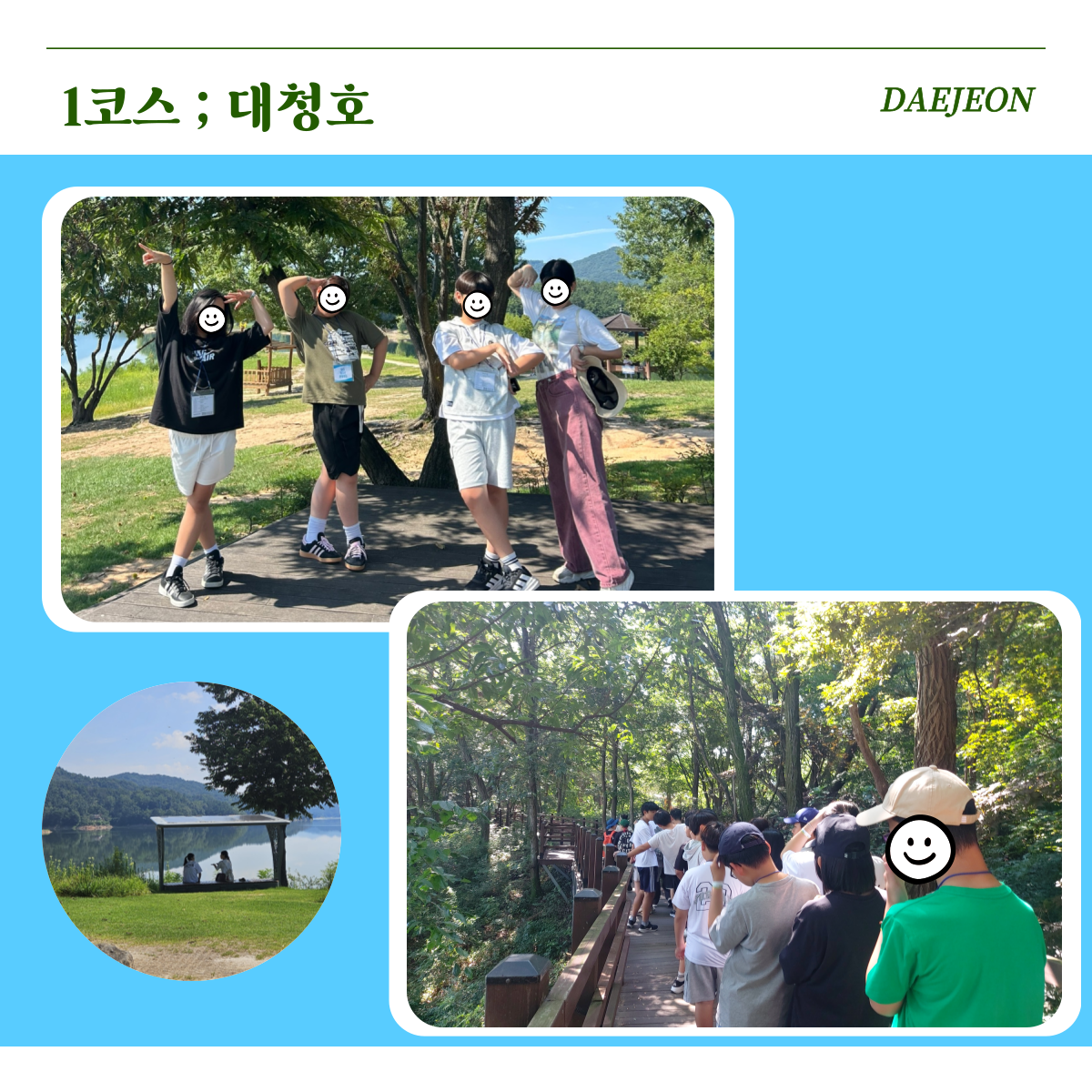 첫 번째 코스는 우리나라에서 세 번째로 큰 대청호 명상정원이었습니다. 대청호의 아름다운 풍경과 어우러진 자연 속을 걸으며 도심과는 또 다른 매력을 느낄 수 있었습니다.
