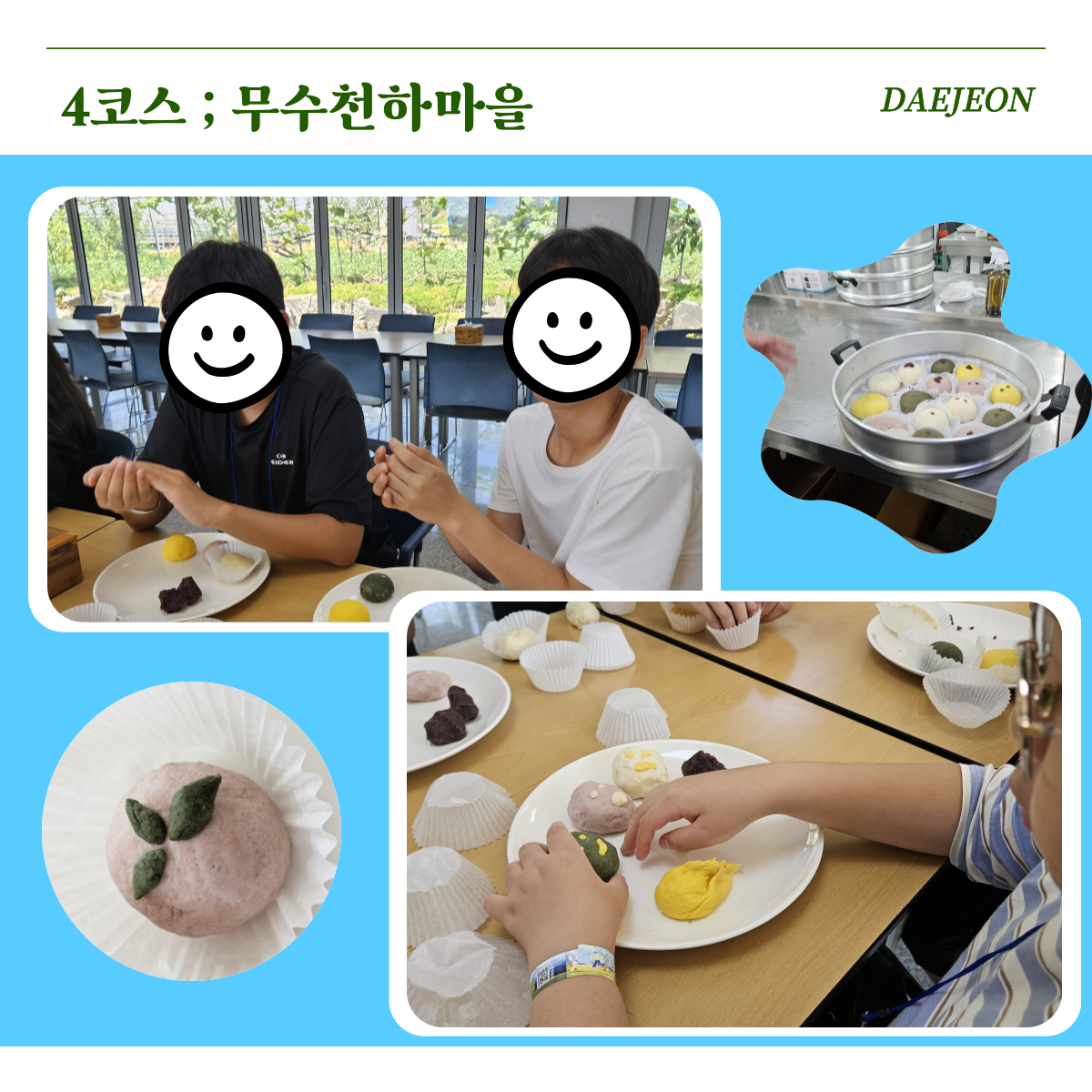 무수천하마을은 대전의 자연 속에서 전통문화를 직접 체험할 수 있는 마을로, 찐빵 만들기와 전통 음식, 농촌 활동 등을 즐길 수 있는 곳입니다. 이번에 기댈나무 청소년들은 찐빵 만들기에 도전했는데요. 직접 반죽을 빚고 모양을 내며 각자의 개성이 담긴 찐빵을 완성했습니다.