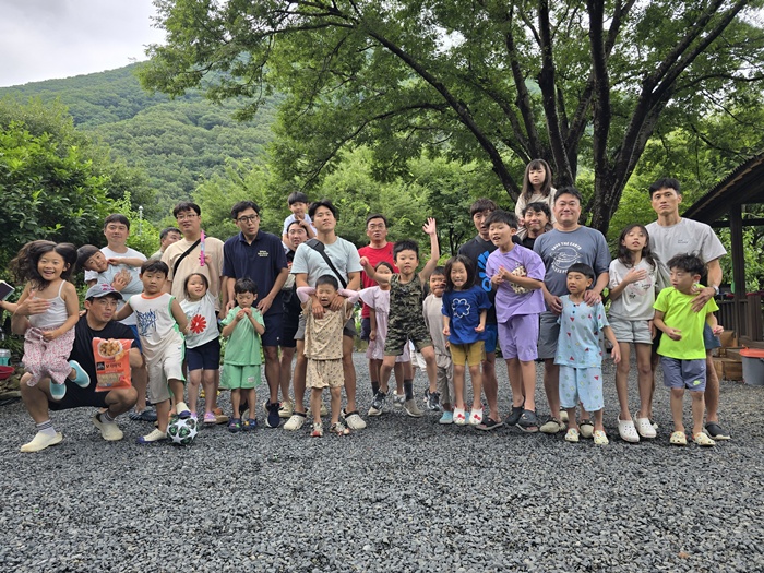 드디어 밀양으로 떠나는 날, 주말 내내 이어진 비 소식에 아빠들의 마음은 편치 않았습니다. 가는 길에도 날씨가 오락가락했지만, 계곡에 도착했을 때는 다행히 흐리기만 했을 뿐 비가 오지 않아 아이들이 물놀이하기에 딱 좋은 날씨가 되었습니다. 아이들은 누가 먼저라고 할 것 없이 빠르게 수영복으로 갈아입고 신나게 계곡으로 뛰어들었습니다. 약 20명의 아이들이 계곡을 뛰어다니며 노는 모습에 정신은 없었지만, 해맑게 웃는 아이들을 보며 아빠들의 얼굴에도 행복한 미소가 번졌습니다. 계곡 돌에 미끄러져 다리를 찧은 아이가 “삼촌, 다리가 안 움직여져”라며 울먹이기도 했지만, 잠시 쉬었다가 곧 다시 뛰어가는 모습을 보며 아빠들은 묘한 뿌듯함을 느꼈습니다.