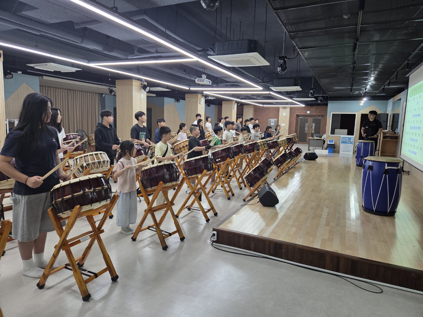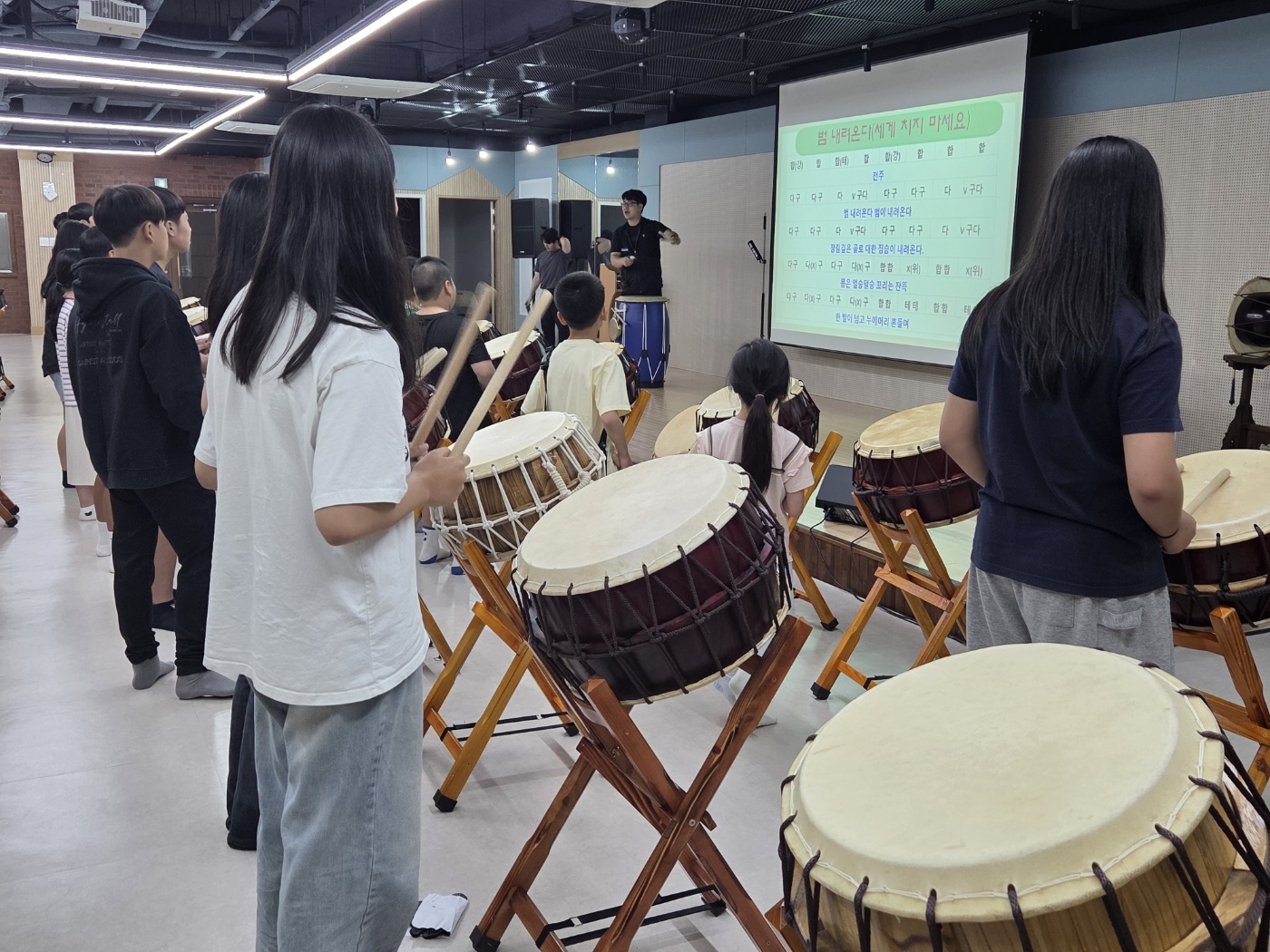 처음에는 다소 어색하게 북을 두드리던 아이들은 북채를 손에 쥐자 금세 리듬에 몸을 맡겼습니다. 선생님의 설명에 따라 박자를 맞춰 연주하던 아이들은 어느새 음악과 하나가 되어, 몸음 움직이며 서로 호흡을 맞췄습니다. 힘차게 울려퍼지는 북소리는 아이들의 마음 속 스트레스를 시원하게 날려보내는 듯 했고 모두가 하나로 어우러지는 특별한 경험이 되었습니다.