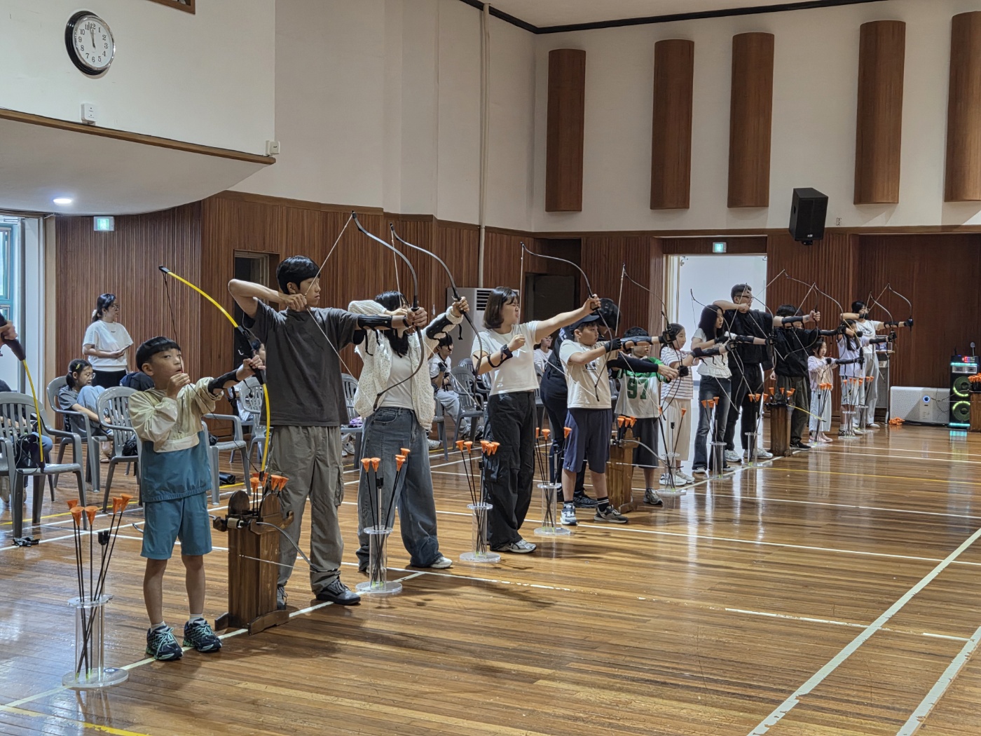 평소 쉽게 접하기 어려운 전통 무예인 국궁을 배울 기회에 아이들의 눈이 반짝였습니다. 국궁에 대한 설명을 듣고, 활을 쏘는 방법을 익힌 후 한 명씩 과녁을 향해 활시위를 당겨봅니다. 처음엔 과녁에 활을 맞히는 것이 쉽지 않았지만, 점점 과녁에 활이 가까워지며 아이들은 자신감을 가지고 국궁에 몰입했습니다. 아이들은 활이 정확히 맞지 않아도 도전 자체를 즐기며 친구들과 함께 웃고 격려하는 소중한 시간을 보냈습니다.