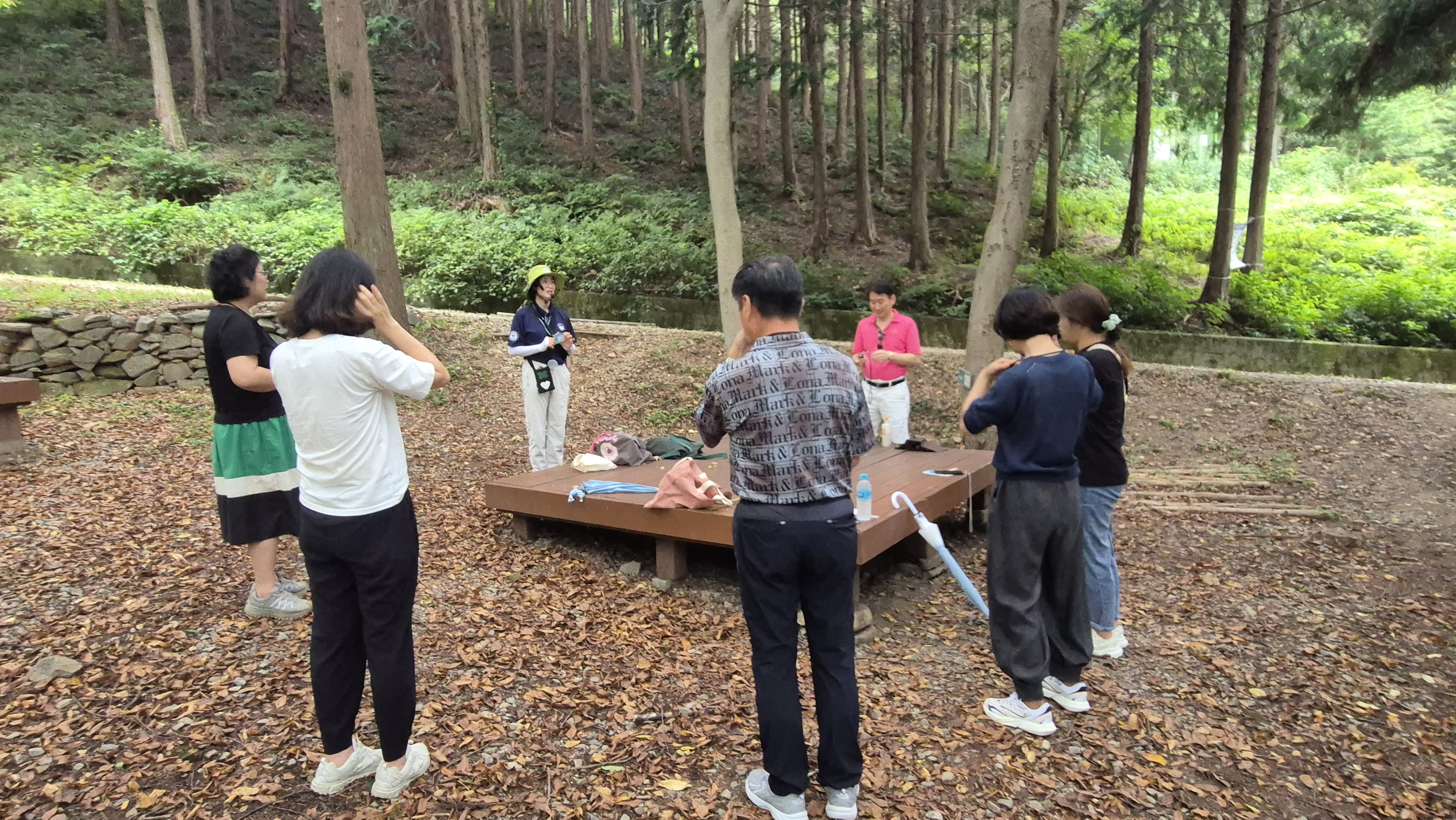 숲해설 프로그램을 신청해 숲해설가와 함께 숲길을 걸었습니다. 조정순 위원이 가져온 영양 가득한 쑥떡으로 간단히 요기를 하고, 노래와 율동으로 몸을 푼 뒤 본격적인 탐방이 시작되었습니다. 루페로 들여다본 다양한 식물과 꽃들은 평소 그냥 지나쳤다면 놓쳤을 풍경이었습니다. 숲속에서 시 한 수 읊으며 마음의 여유를 만끽하는 시간도 가졌다. 탐방 후에는 모두가 작은 시인이 되어 소감을 글로 남겼습니다다. 숲해설가가 선물한 알록달록 편백 팔찌를 함께 착용하고 기념사진도 남겼습니다.
