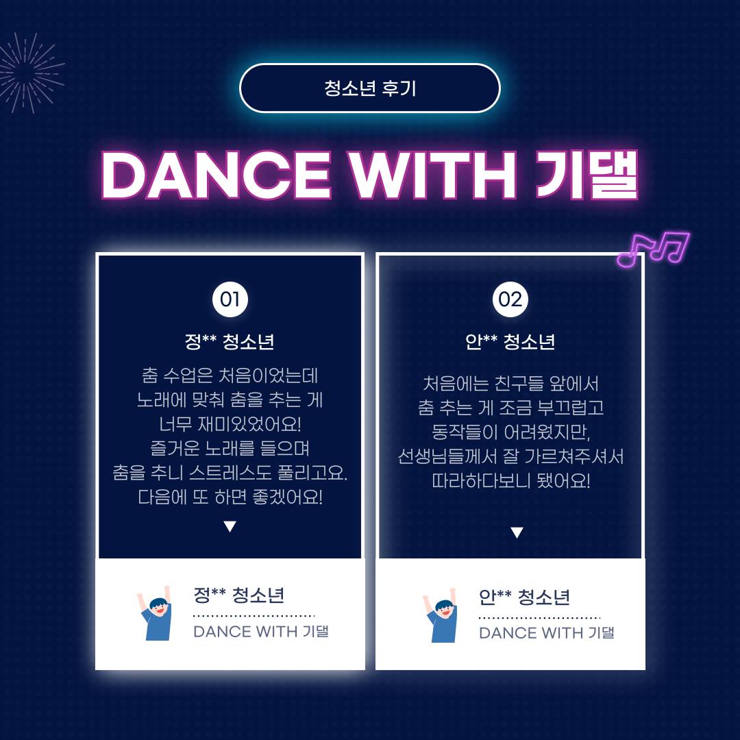노래를 들으며 춤을 추는 시간이 스트레스 해소에도 도움이 되고 즐거웠다는 기댈 청소년들의 반응에 선생님들도 기쁨의 댄스를 추었답니다