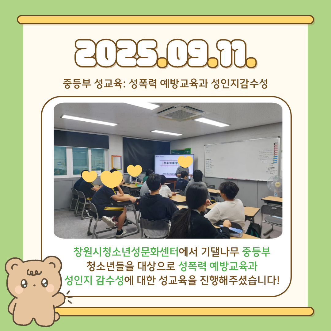 기댈나무에서는 9월 4일, 9월 11일 창원시청소년성문화센터와 함께 성교육을 진행하였습니다!