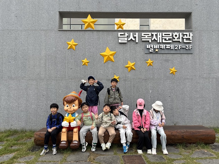약간의 날씨 걱정은 있었지만, 아이들은 신나고 설레는 마음으로 대구로 향했습니다. 첫 도착지는 달서구 목재문화관이었습니다. 약 1시간 20분의 이동 시간이 걸렸지만, 지루할 틈은 없었습니다. 함께 노래를 부르고 오늘 수행할 미션을 소개하는 시간을 가지며 즐겁게 이동했습니다. 이어 생태단 DJ가 되어 각자 신청곡을 들으며 웃음이 끊이지 않았습니다. 어느새 버스는 목적지에 도착했습니다.