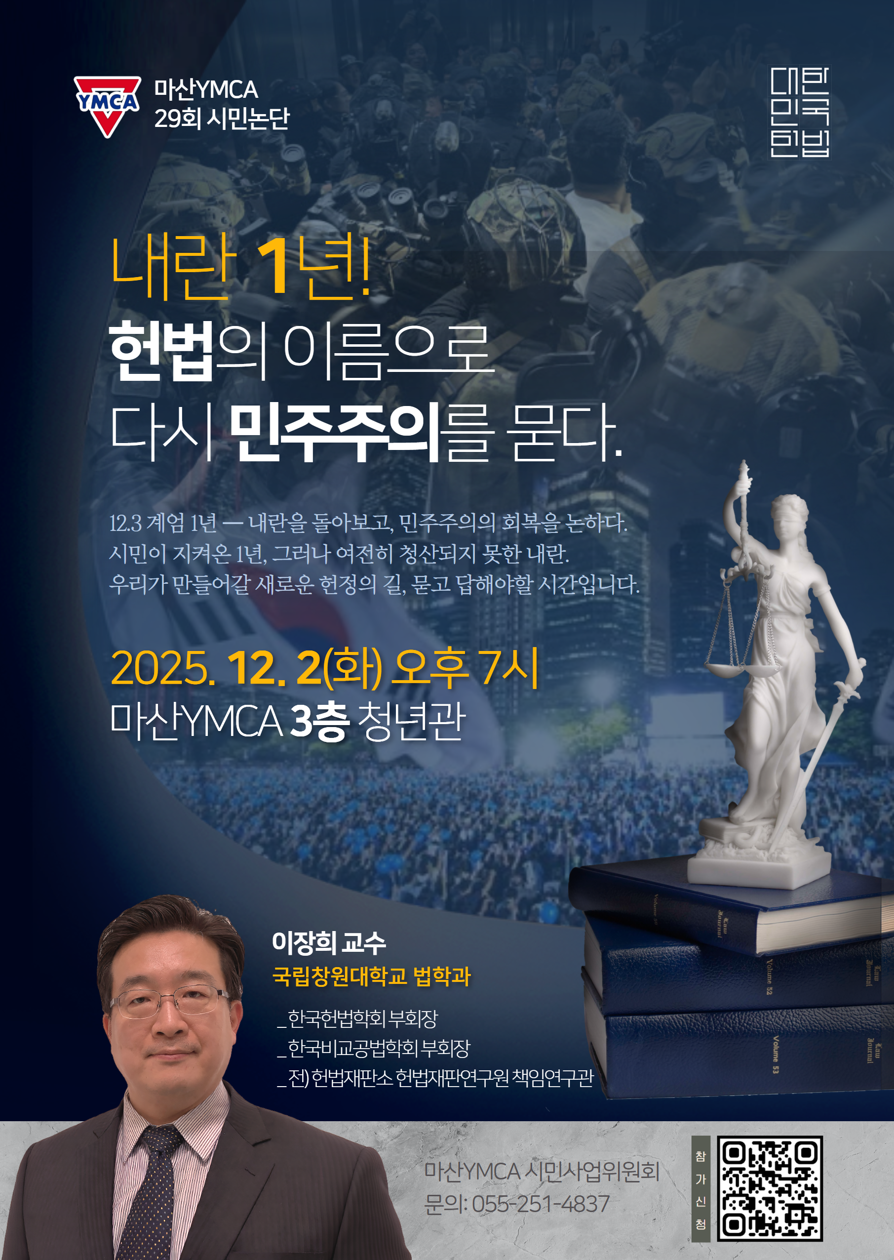 마산YMCA 시민사업위원회는 12월 2일 저녁 7시 ‘내란 1년! 헌법의 이름으로 다시 민주주의를 묻다’를 주제로 시민논단을 엽니다.