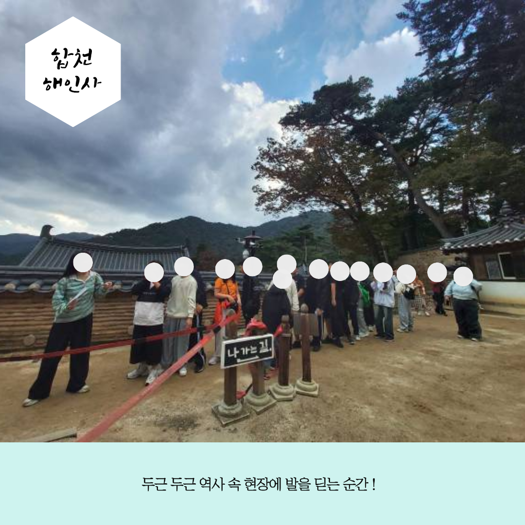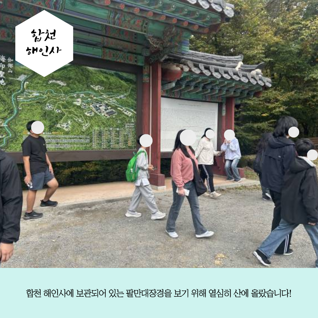 이후 방문한 합천 해인사에서는 세계기록유산인 팔만대장경을 직접 살펴보았습니다. 해인사로 향하는 길은 생각보다 가파르고 산길에 가까웠지만, 체력 좋은 우리 청소년들이 씩씩하게 걸어 올라가는 모습이 멋있었습니다.