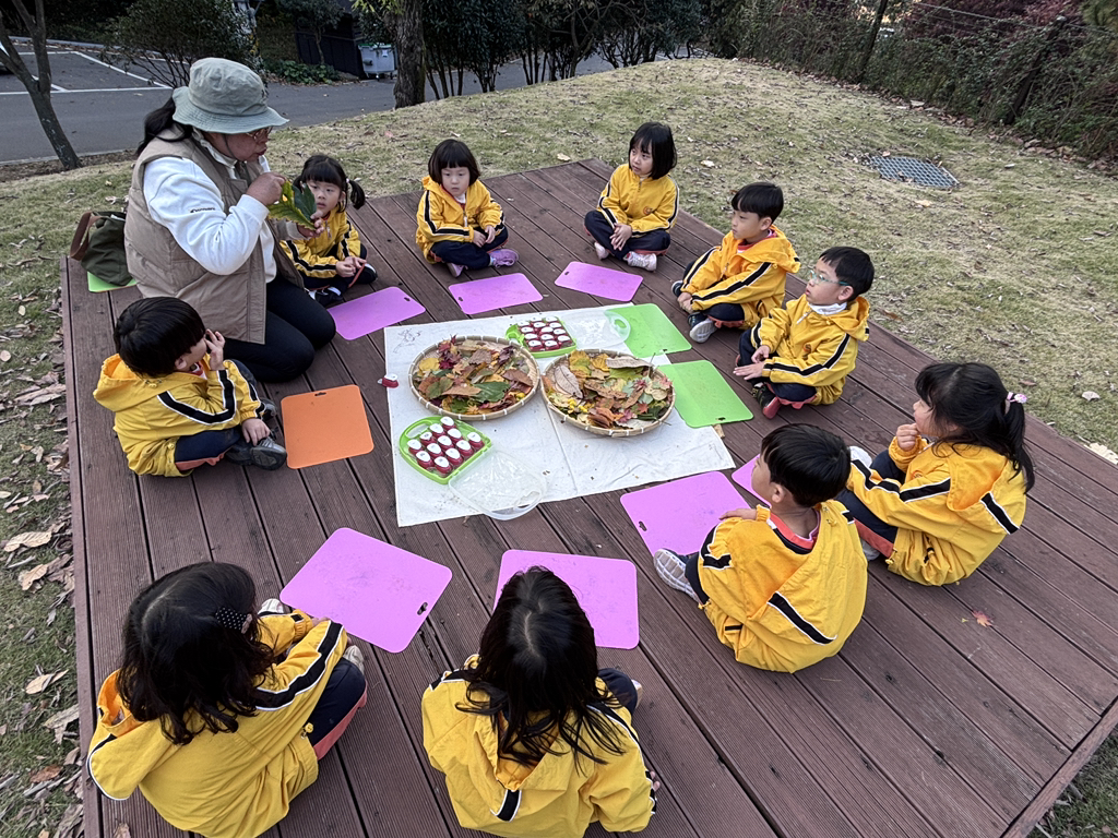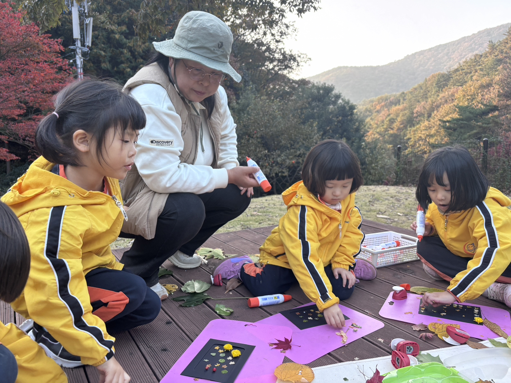 아이들이 해맑게 노는 모습을 보시던 휴양림에 근무하시는 숲치료사 선생님께서 오시더니 ,휴양림에 아이들 소리가 나니 참 좋다 하시더군요. 그러시면서 숲체험을 해주시겠다 하셨답니다. 보통 휴양림 가서 단체 숲프로그램 신청하면 싫어하시는 내색을 하시는 곳도 많은데 먼저 오셔서 제안해주시고 수업에 너무나 알차고 재밌었습니다. 5세, 6세, 7세 모두 연령을 수업해주시고 얼마나 감사했는지 모릅니다.