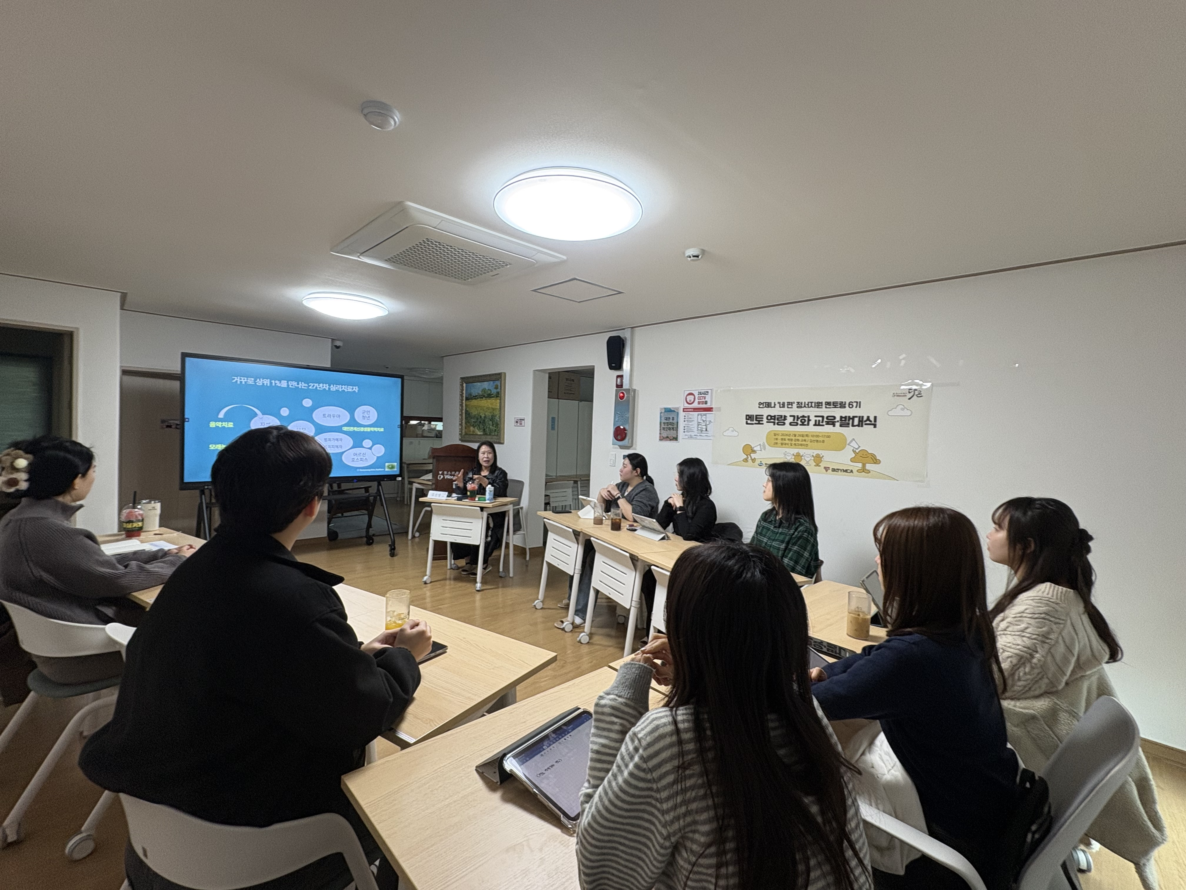 이날 오전 10시부터 12시까지는 나맘 아동가족심리연구소 김선영 소장님의 강의로 멘토 역량강화 교육이 진행되었습니다. ‘멘티 청소년과의 건강한 관계 형성’을 주제로 한 이번 교육에서는 1:1 멘토링 활동에서 멘토가 갖추어야 할 태도와 자세에 대해 깊이 있게 다루었습니다. 청소년의 문제를 해결해 주는 조력자가 되기보다, 그들의 삶을 존중하며 곁에서 함께 걸어가는 동반자가 되어야 함을 되새기는 뜻깊은 시간이었습니다.